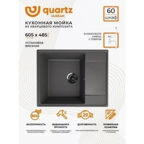 Мойка ULGRAN Quartz Prima 605 из кварцевого композита на основе акрилированных термоактивных полиэфирных смол (20%) и пигментированного кварцевого песка (80%). Мойка характеризуется высокой твердостью и ударопрочностью, что говорит о долгом сроке службы. Благодаря отсутствию пористости поверхность мойки устойчива к загрязнениям. За мойкой легко ухаживать с помощью обычных моющих средств.