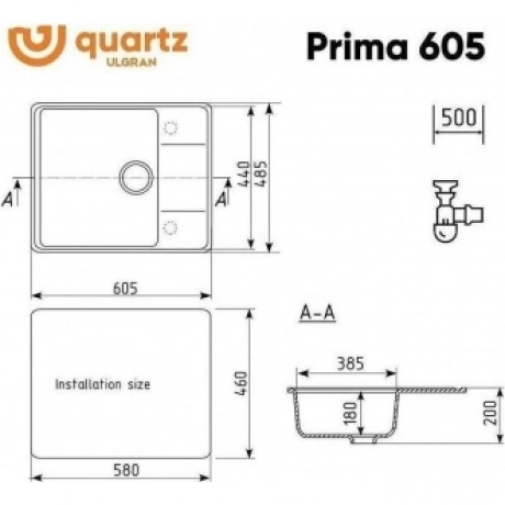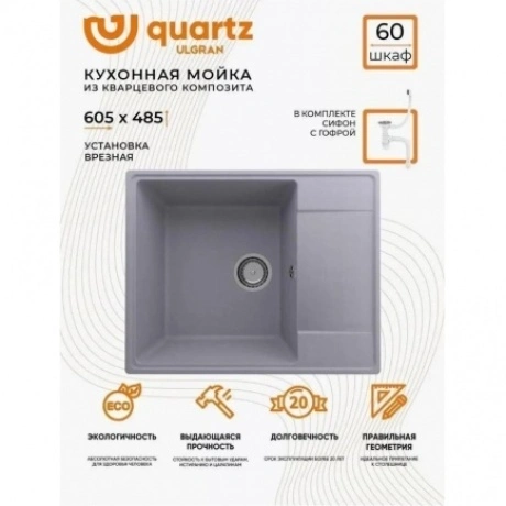 Мойка ULGRAN Quartz Prima 605 из кварцевого композита на основе акрилированных термоактивных полиэфирных смол (20%) и пигментированного кварцевого песка (80%). Мойка характеризуется высокой твердостью и ударопрочностью, что говорит о долгом сроке службы. Благодаря отсутствию пористости поверхность мойки устойчива к загрязнениям. За мойкой легко ухаживать с помощью обычных моющих средств.