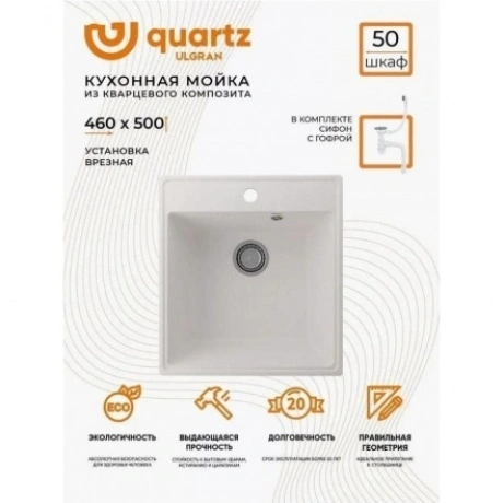 Мойка ULGRAN Quartz Forte 460 изготовлена из кварцевого композита на основе акрилированных термоактивных полиэфирных смол (20%) и пигментированного кварцевого песка (80%). Материал обеспечивает стойкость к бытовым ударам, истиранию и царапинам. Идеальное прилегание к столешнице облегчает монтаж мойки.