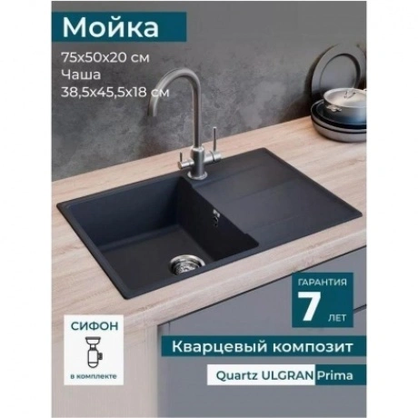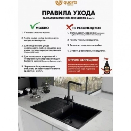 Мойка ULGRAN Quartz Prima 750 из кварцевого композита на основе акрилированных термоактивных полиэфирных смол (20%) и пигментированного кварцевого песка (80%). Мойка характеризуется высокой твердостью и ударопрочностью, что говорит о долгом сроке службы. Благодаря отсутствию пористости поверхность мойки устойчива к загрязнениям. За мойкой легко ухаживать с помощью обычных моющих средств.
