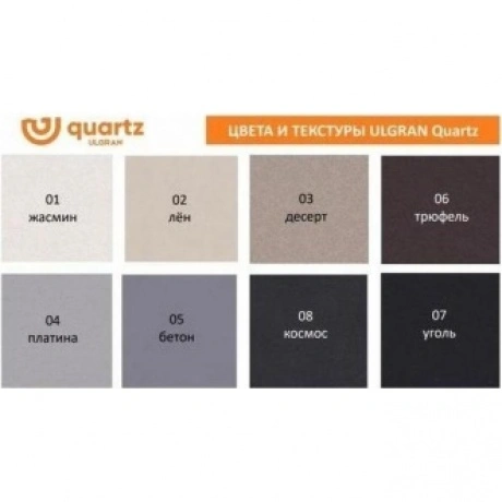 Мойка ULGRAN Quartz Prima 780 из кварцевого композита на основе акрилированных термоактивных полиэфирных смол (20%) и пигментированного кварцевого песка (80%). Мойка характеризуется высокой твердостью и ударопрочностью, что говорит о долгом сроке службы. Благодаря отсутствию пористости поверхность мойки устойчива к загрязнениям. За мойкой легко ухаживать с помощью обычных моющих средств.