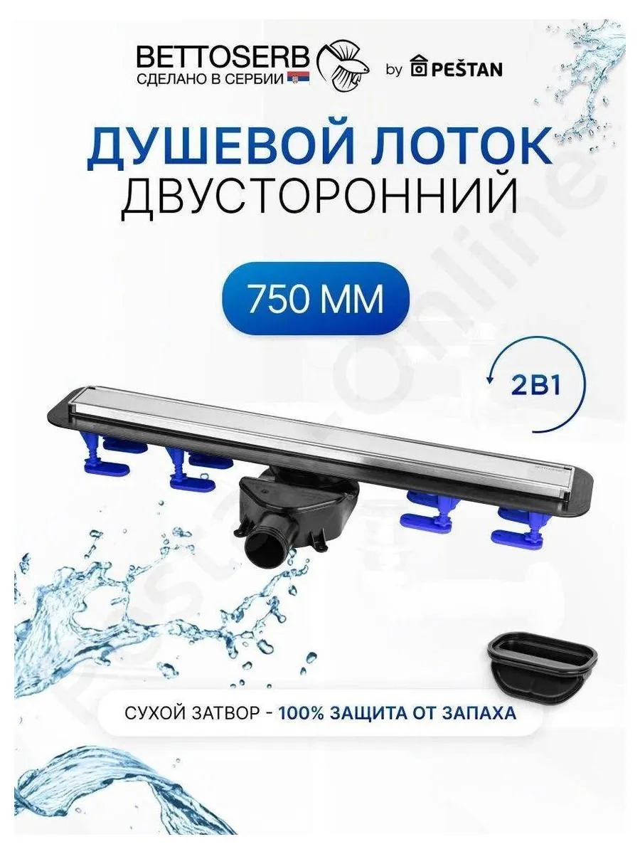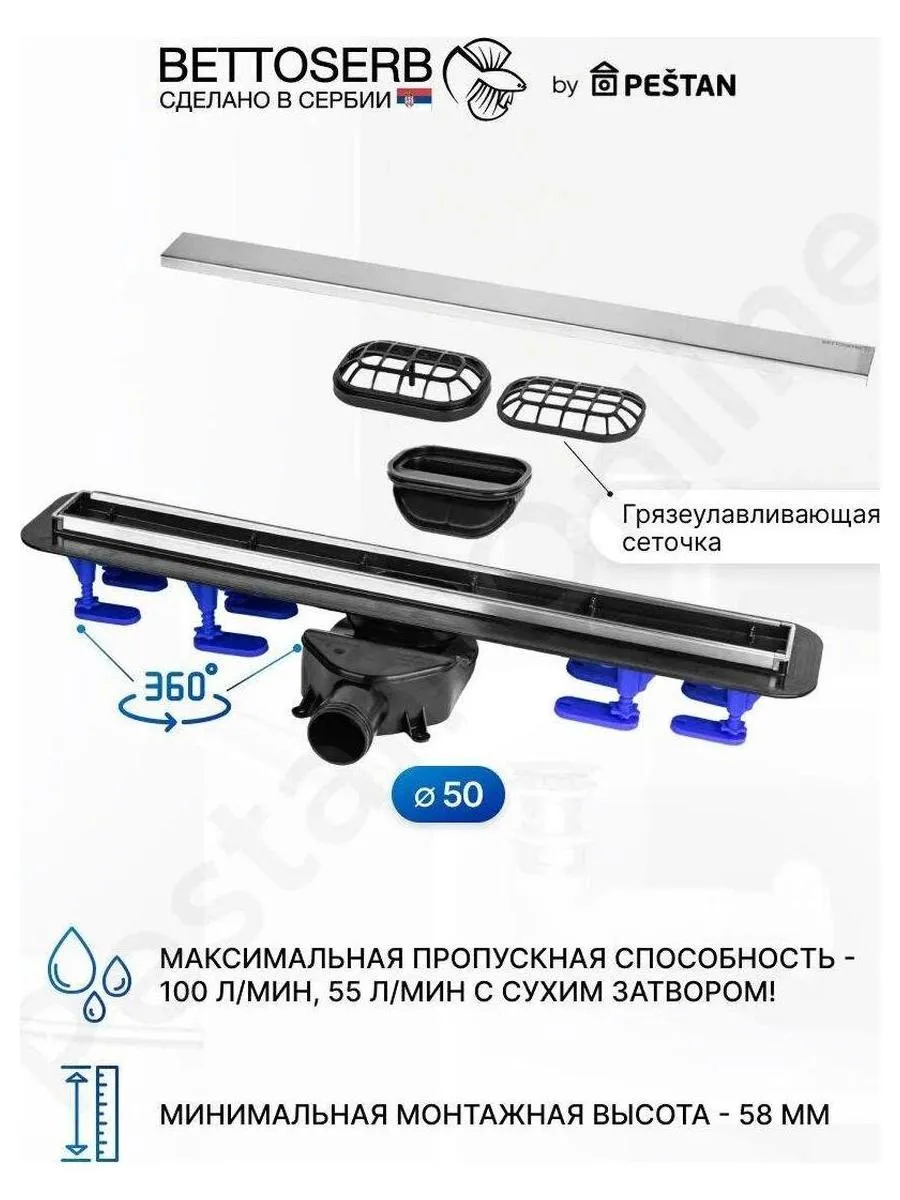Душевой лоток BETTOSERB 750 Line высокое качество материалов, легкость монтажа и простота обслуживания, S-образный сифон, разработанный с высокой степенью функциональности, предотвращает проникновение запахов из канализации. Водяной столб и механическая заслонка эффективно препятствуют проникновению неприятного запаха из канализации, длительный срок эксплуатации, возможность регулировки высоты и наклона трапа за счет опор, входящих в комплект.