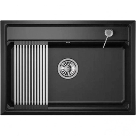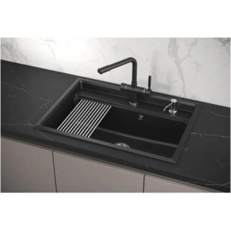 Мойка с широкой и вместительной чашей, идеально подходящей для крупной посуды. Изготовлена из кварцевого песка, она устойчива к царапинам и абразивам, а также не боится высоких температур.