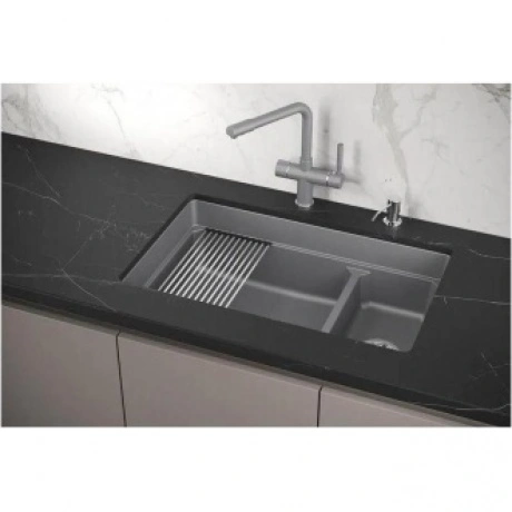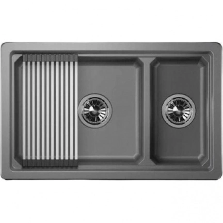 Двухсекционная мойка прямоугольной формы для установки под столешницу в шкаф 800мм. В каждой чаши мойки есть удобная площадка для установки ролл-мата или разделочной доски. Мойка выполнена из кварцевого композитного материала высокой плотности и гигроскопичности, что обеспечивает не менее 20 лет надежной эксплуатации.