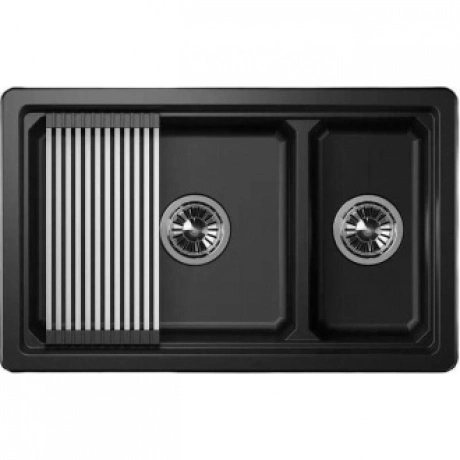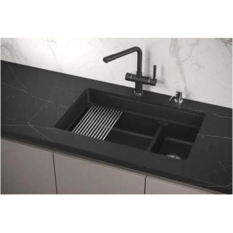 Мойка российского производителя Granula. Двухсекционная кухонная мойка прямоугольной формы для установки под столешницу в шкаф 800мм. Представляет собой инновационный комплекс с удобной площадкой внутри чаши для установки ролл мата или разделочной доски. Выполнена из кварцевого композитного материала высокой плотности и гигроскопичности, что обеспечивает не менее 20 лет надежной эксплуатации. Ролл-мат и дозатор из нержавеющей стали идут в комплекте.