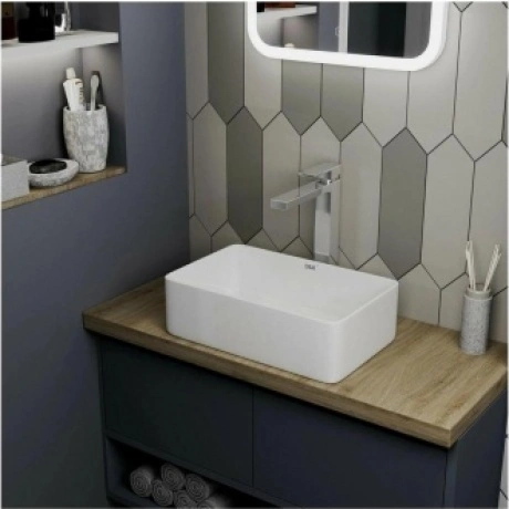 Раковина накладная для ванной DK Berlin, чаша прямоугольная, без отверстия под смеситель, без перелива, белая, изготовлена из фарфора, для установки на столешницу.