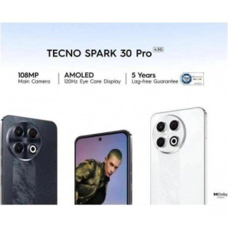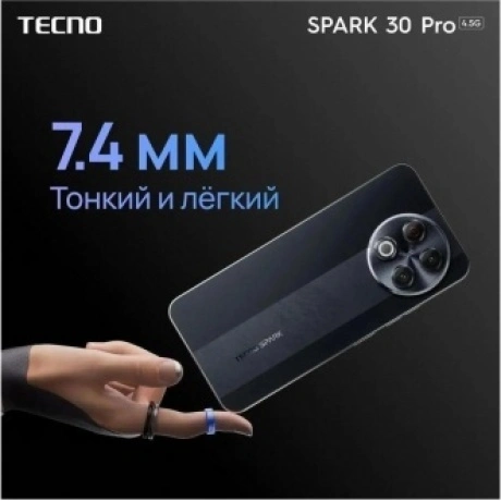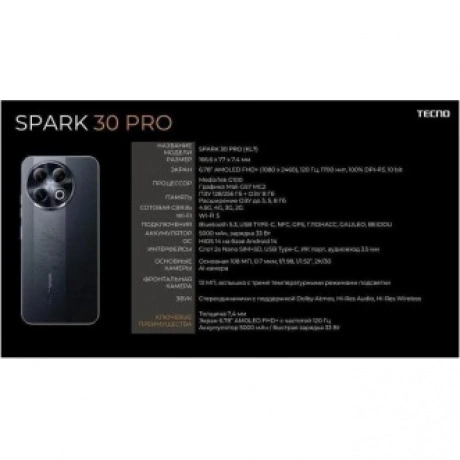 Смартфон Tecno Spark 30 Pro в изящном и тонком корпусе чёрного цвета оснащён 6.78-дюймовым экраном с разрешением 2436x1080. Смартфон работает под управлением операционной системы Android 14 и питается от литий-полимерного аккумулятора ёмкостью 5000 мАч.