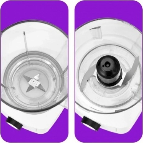 блендер, моторный блок, блок ножей блендера с уплотнительным кольцом, чаша блендера, крышка чаши блендера с уплотнительным кольцом, мерный колпачок, чаша измельчителя с крышкой и уплотнительным кольцом, блок ножей измельчителя, основание блока ножей измельчителя, руководство по эксплуатации, упаковка