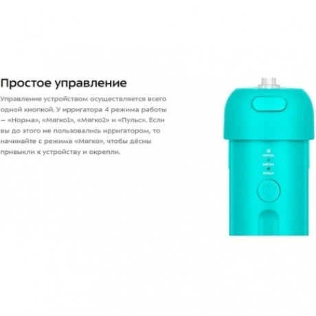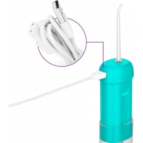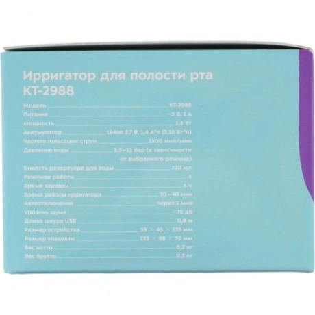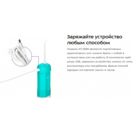 Управление устройством осуществляется всего одной кнопкой. У ирригатора 4 режима работы – «Норма», «Мягко1», «Мягко2» и «Пульс». Если вы до этого не пользовались ирригатором, то начинайте с режима «Мягко», чтобы дёсны привыкли к устройству и окрепли. В комплекте к ирригатору идут 2 струйные насадки. Насадка является индивидуальным аксессуаром для каждого члена семьи. Чтобы извлечь насадку, необходимо нажать на кнопку снятия насадки, а затем потянуть насадку вверх. Ёмкость резервуара для воды составляет 120 мл. Этого количества достаточно, чтобы обработать все труднодоступные участки во рту. Чтобы наполнить резервуар, необходимо всего лишь открыть крышку резервуара и налить в него воду или специальный раствор. Модель КТ-2988 является портативным ирригатором: его можно брать с собой в путешествия или на работу. В комплекте идёт шнур USB, заряжать устройство можно от сети, компьютера или пауэрбанка. Время полной зарядки составляет около 4 часов.