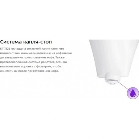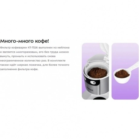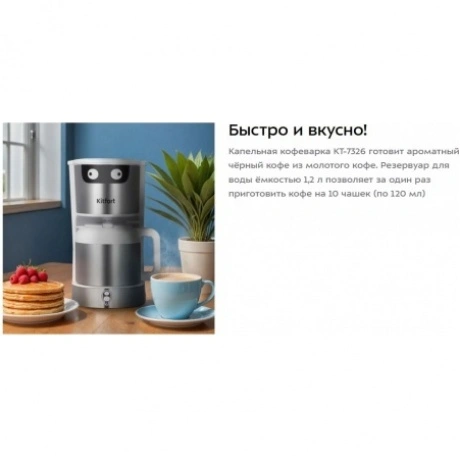 Капельная кофеварка КТ-7326 готовит ароматный чёрный кофе из молотого кофе. Резервуар для воды ёмкостью 1.2 л позволяет за один раз приготовить кофе на 10 чашек (по 120 мл)