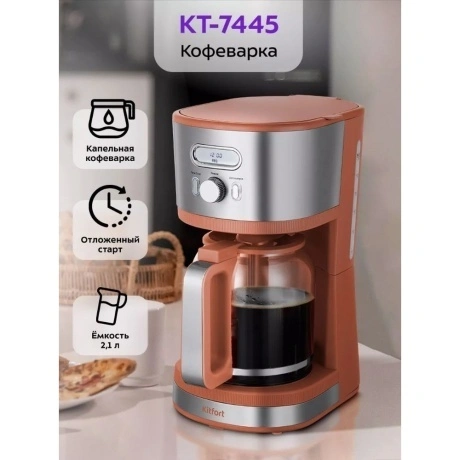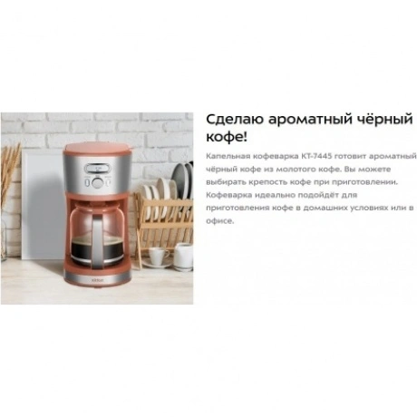 Капельная кофеварка КТ-7445 готовит ароматный чёрный кофе из молотого кофе. Вы можете выбирать крепость кофе при приготовлении. Кофеварка идеально подойдёт для приготовления кофе в домашних условиях или в офисе.