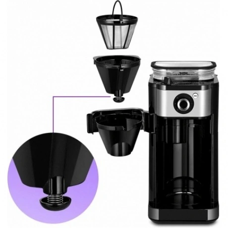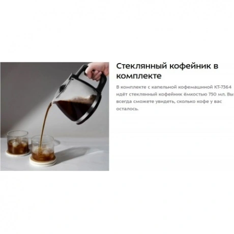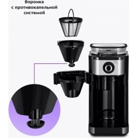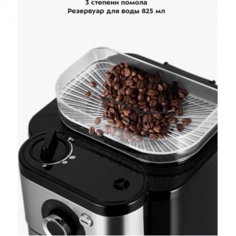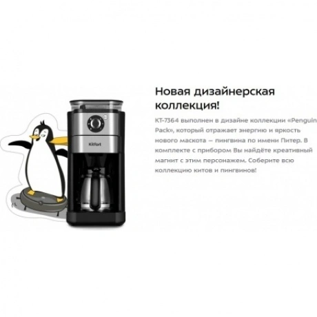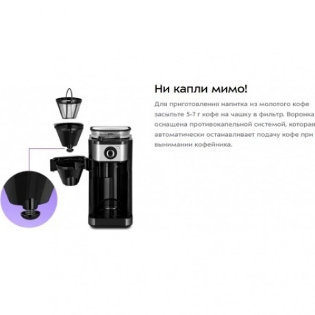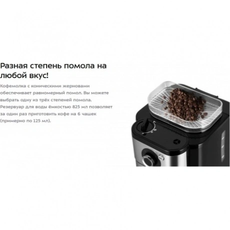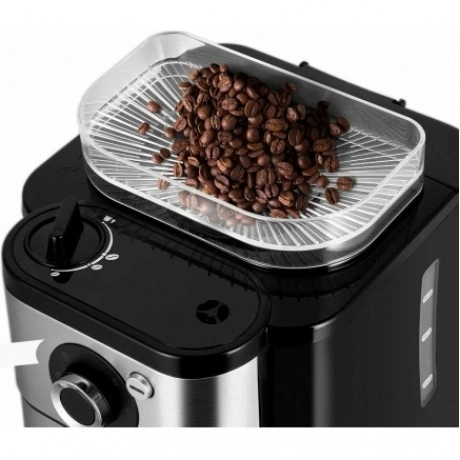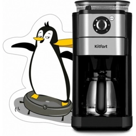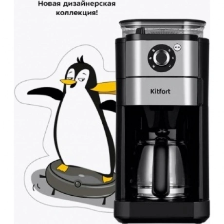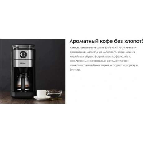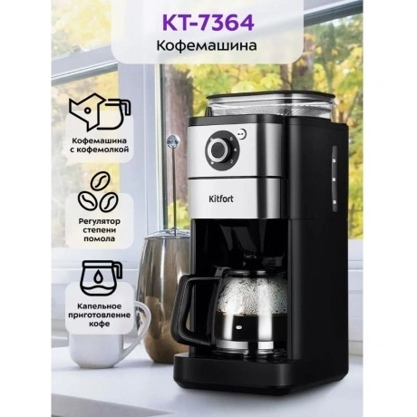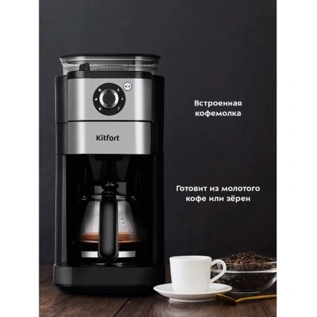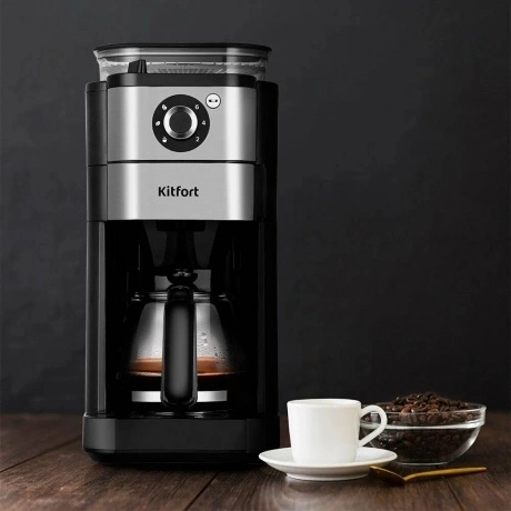 Капельная кофемашина Kitfort КТ-7364 готовит ароматный напиток из молотого кофе или из кофейных зёрен. Встроенная кофемолка с коническими жерновами автоматически измельчит кофейные зерна и подаст их сразу в фильтр. Управление кофемашиной осуществляется через переключатель и кнопку на панели. Индикация и звуковые сигналы сообщают о процессе. Регулятор помола позволяет легко настроить степень измельчения кофейных зёрен. В комплекте с капельной кофемашины КТ-7288 идёт стеклянный кофейник ёмкостью 750 мл. Вы всегда сможете увидеть, сколько кофе у вас осталось. Кофемолка с коническими жерновами обеспечивает равномерный помол. Вы можете выбрать одну из трёх степеней помола. Резервуар для воды ёмкостью 825 мл позволяет за один раз приготовить кофе на 6 чашек (примерно по 125 мл). Для приготовления напитка из молотого кофе засыпьте 5-7 г кофе на чашку в фильтр. Воронка оснащена противокапельной системой, которая автоматически останавливает подачу кофе при вынимании кофейника. В месте установки кофейника находится платформа с подогревом. По завершении приготовления кофе включается подогрев на 40 минут.