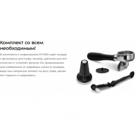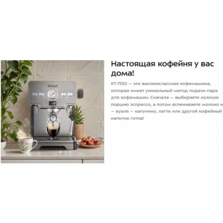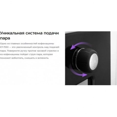 КТ-7530 – это высококлассная кофемашина, которая имеет уникальный метод подачи пара для кофемашин. Сначала – выбираете нужную порцию эспрессо, а потом вспениваете молоко и – вуаля – капучино, латте или другой кофейный напиток готов!