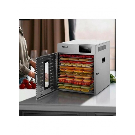 Вместительная сушилка для овощей и фруктов КТ-4918 на 37 поддонов и с прозрачной дверцей сохранит любимые фрукты и овощи полезными круглый год Она предназначена для сушки овощей, фруктов, ягод, грибов, корнеплодов, трав, а также мяса и рыбы, хлеба.