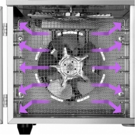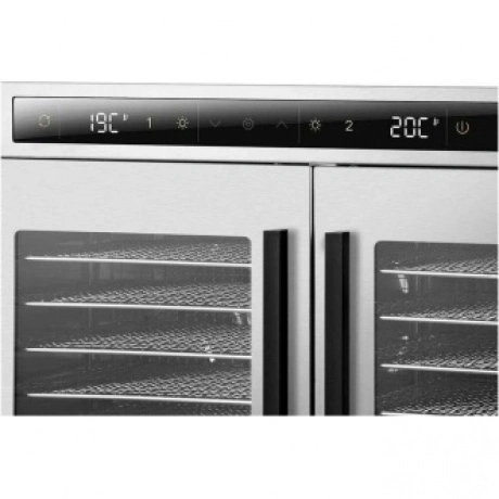 Электрическая сушилка предназначена для сушки овощей, фруктов, ягод, грибов, корнеплодов, трав и зелени, а также мяса и рыбы, хлеба. Сушилка имеет две независимые камеры, в каждую их которых может быть установлено по 6 металлических поддонов. В комплект также входят сетки для мелких продуктов и сплошные поддоны. В левой камере находится вращательный механизм с крючками, на которых можно сушить продукты в вертикальном виде