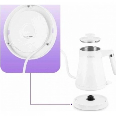 Электрический чайник КТ-6727 предназначен для кипячения воды и приготовления кофе способами кемекс и пуровер. Контролируйте пролив воды с помощью длинного изогнутого носика и сделайте идеальный напиток.