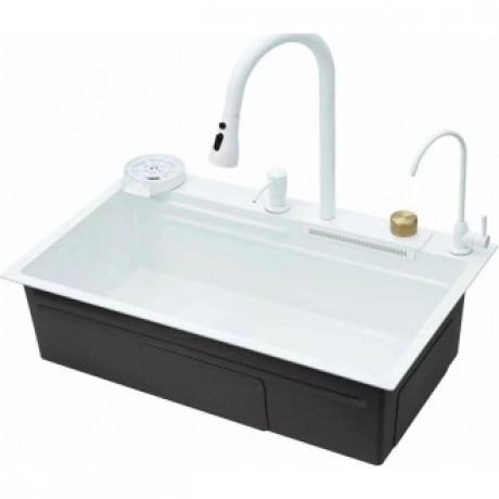 Мойка оснащена панелью со смесителем и дисплеем, водопадом, краном для питьевой воды и ополаскивателем стакана. Благодаря модульной структуре мойки, можно менять местами чаши, устанавливать разделочную доску в разных положениях, что значительно экономит место на кухне и позволяет избежать лишних загрязнений.