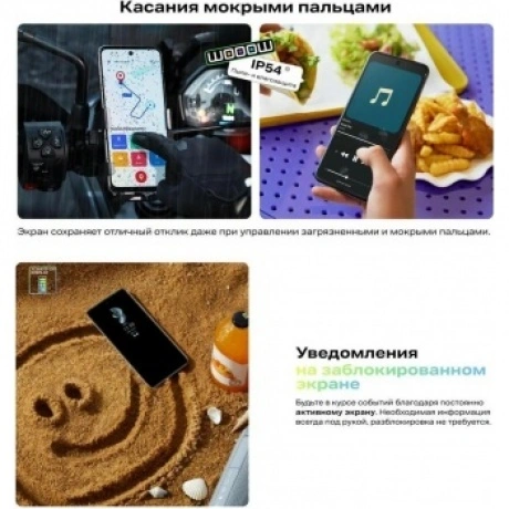 Смартфон оснащен защитой от пыли и брызг (IP54), стереодинамиками, разъемом 3.5 мм, поддержкой Wi-Fi 5, Bluetooth 5.4, GPS, USB-C, сканером отпечатков пальцев (сбоку).