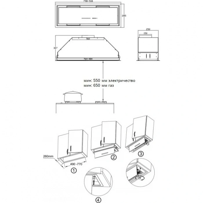 Встраиваемая, скрытая кухонная вытяжка, ширина 51.8 см, тип очистки воздуха: отвод, рециркуляция, количество скоростей 5, макс производительность 950 м3/ч, сенсорное управление, дополнительные функции: таймер автоотключения, индикатор загрязнения фильтров, пульт дистанционного управления, металлический жироулавливающий фильтр.