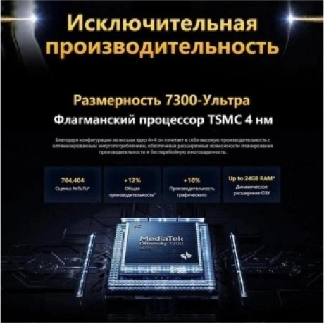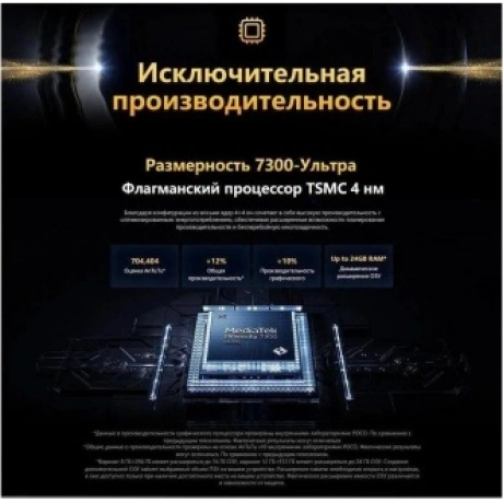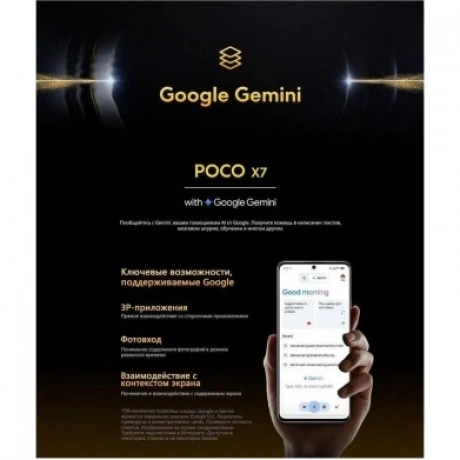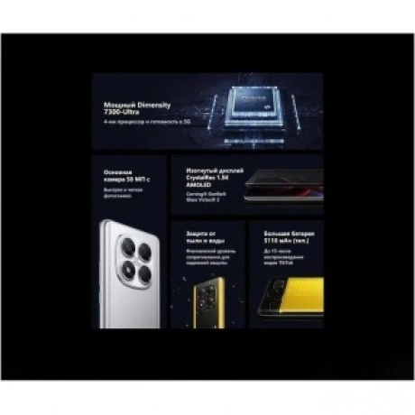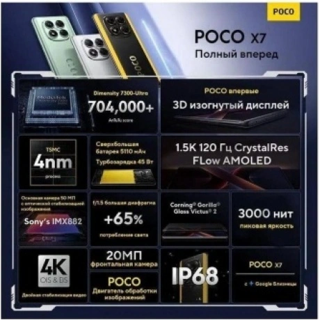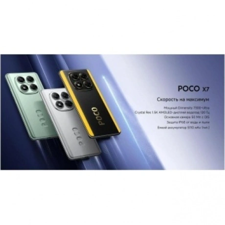POCO X7 — это мощный и стильный смартфон с большим экраном и высоким разрешением. Устройство оснащено ярким и четким AMOLED дисплеем с диагональю 6.67 дюймов и разрешением 2712x1220 пикселей, который обеспечивает отличное качество изображения и комфортное использование. Смартфон работает на базе операционной системы Android 14 с фирменной оболочкой HyperOS 2, которая предлагает удобный и интуитивно понятный интерфейс. POCO X7 оснащен мощным процессором Dimensity 7300-Ultra, что обеспечивает быструю и плавную работу устройства. Смартфон также имеет большой объем оперативной памяти LPDDR4X, что позволяет ему легко справляться с многозадачностью и запускать требовательные приложения. Тройная основная камера с оптической стабилизацией позволяет делать качественные и яркие фотографии и видео. Устройство также поддерживает функции искусственного интеллекта, которые помогают улучшить качество изображений и видео. Смартфон имеет емкий аккумулятор на 5110 мАч, что обеспечивает длительное время работы без подзарядки. POCO X7 также поддерживает быструю зарядку мощностью 45 Вт, что позволяет быстро восстановить заряд батареи.