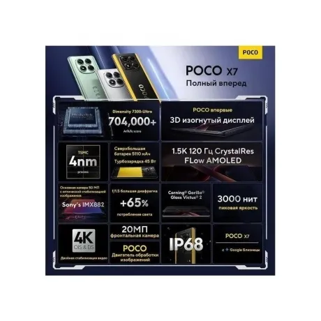 POCO X7 — это мощный и стильный смартфон с большим экраном и высоким разрешением. Устройство оснащено ярким и четким AMOLED дисплеем с диагональю 6.67 дюймов и разрешением 2712x1220 пикселей, который обеспечивает отличное качество изображения и комфортное использование. Смартфон работает на базе операционной системы Android 14 с фирменной оболочкой HyperOS 2, которая предлагает удобный и интуитивно понятный интерфейс. POCO X7 оснащен мощным процессором Dimensity 7300-Ultra, что обеспечивает быструю и плавную работу устройства. Смартфон также имеет большой объем оперативной памяти LPDDR4X, что позволяет ему легко справляться с многозадачностью и запускать требовательные приложения. Тройная основная камера с оптической стабилизацией позволяет делать качественные и яркие фотографии и видео. Устройство также поддерживает функции искусственного интеллекта, которые помогают улучшить качество изображений и видео. Смартфон имеет емкий аккумулятор на 5110 мАч, что обеспечивает длительное время работы без подзарядки. POCO X7 также поддерживает быструю зарядку мощностью 45 Вт, что позволяет быстро восстановить заряд батареи.