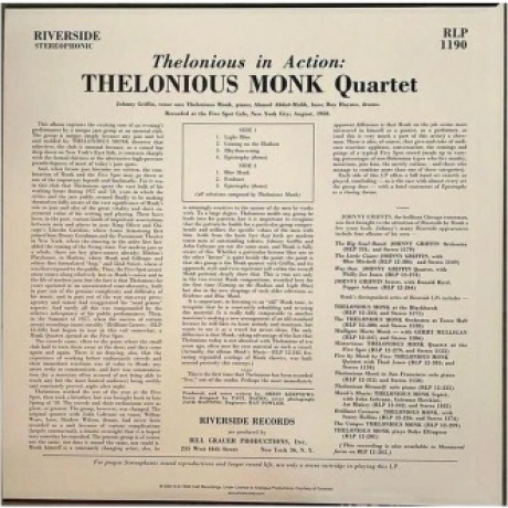 Thelonious in Action был записан вживую в Five Spot Caf? на Манхэттене 7 августа 1958 года. Five Spot, одно из самых известных джазовых залов Нью-Йорка, было местом, где Монк впервые оказался в центре внимания. Ему аккомпанировали тенор-саксофонист Джонни Гриффин, барабанщик Рой Хейнс и басист Ахмед Абдул-Малик. Лимитированное издание на виниле 180 г.. Семь пластинок, выпущенных в серии The Riverside Tenor Sessions, остаются одними из величайших достижений поистине золотого века. Записанные и выпущенные между 1956 и 1961 годами, эти семь альбомов Монка сыграли важную роль в достижении его статуса на вершине джазового пантеона после десятилетия насмешек и пренебрежения.