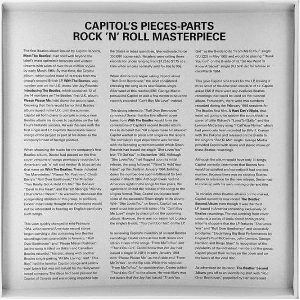 The Beatles Second Album — третий альбом Beatles, выпущенный в США. Он содержит 11 песен, поскольку Capitol Records начали выпускать только одиннадцать песен на своих сборниках Beatles вместо двенадцати, чтобы сэкономить на роялти. Издание на виниле 180 г, моно.. Альбом содержит оставшиеся пять песен с британского альбома With the Beatles, две песни с EP Long Tall Sally (Long Tall Sally и I Call Your Name), сингл She Loves You / Ill Get You и два сингла B-side: Thank You Girl и You Cant Do That. Альбом достиг первого места в чартах альбомов в США и оставался там в течение 5 недель. Было продано более 2 миллионов копий в США. Мастеринг был выполнен Кевином Ривзом в студии East Iris Studios в Нэшвилле с использованием оригинального моно-мастера 1964 года. Новое издание остается верным оригинальному релизу, позволяя услышать больше музыкальной информации, чем было возможно ранее. Включает в себя точно воссозданную обложку и новую четырехстраничную вставку с эссе американского историка Beatles Брюса Спайзера