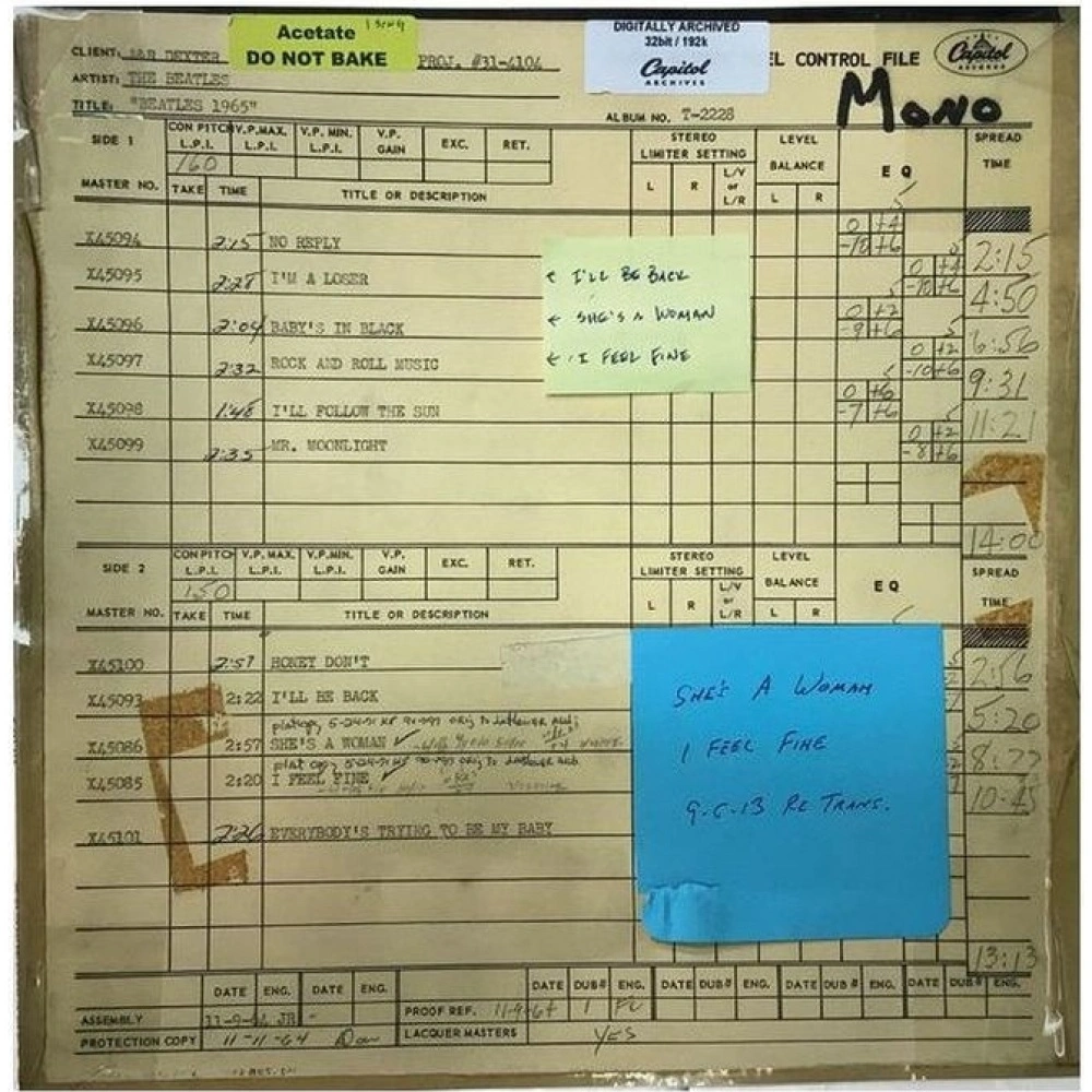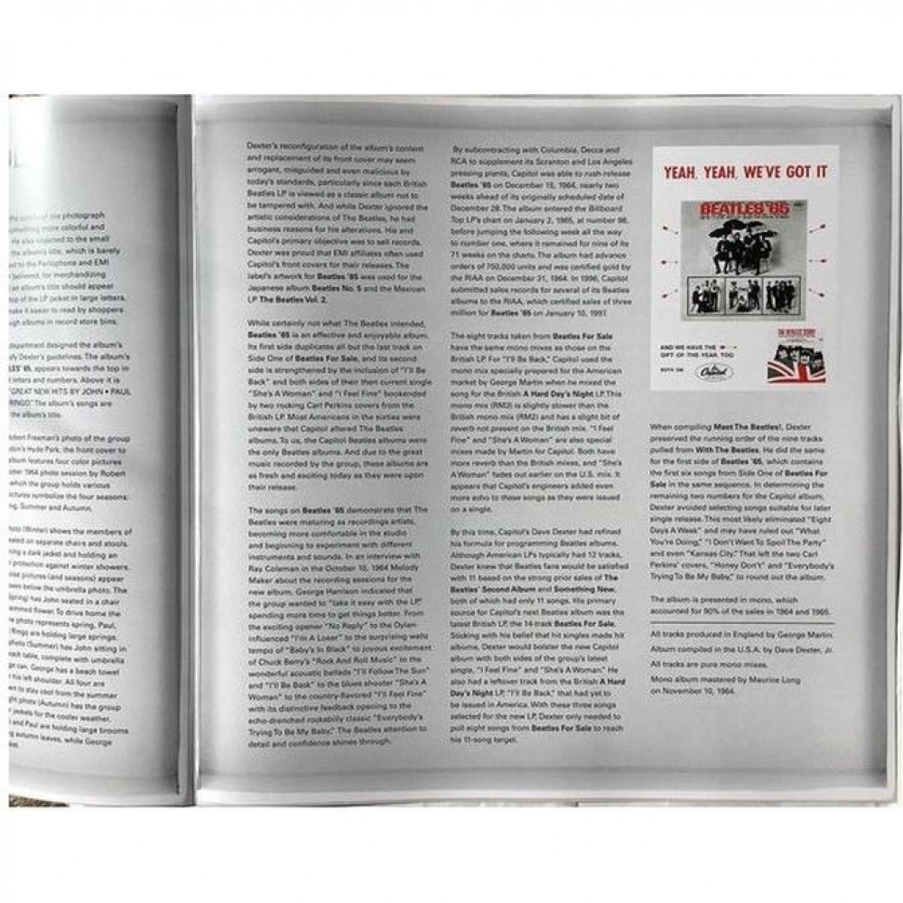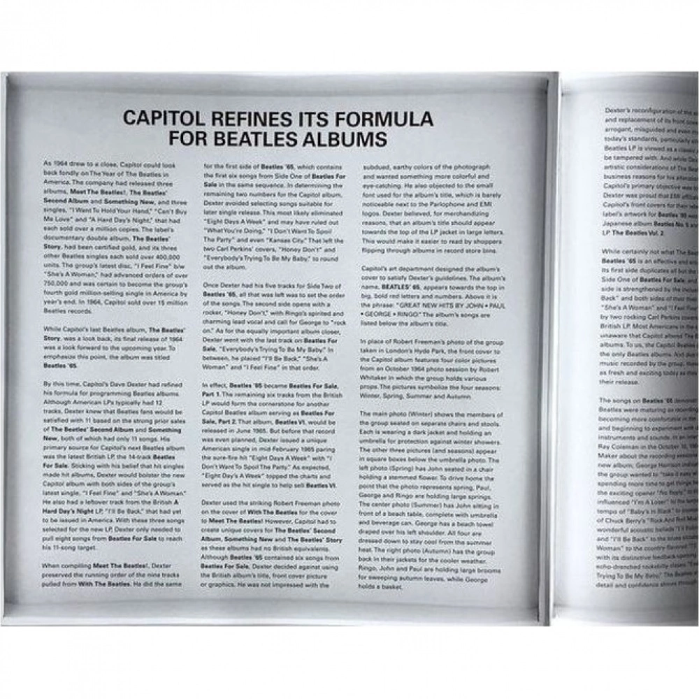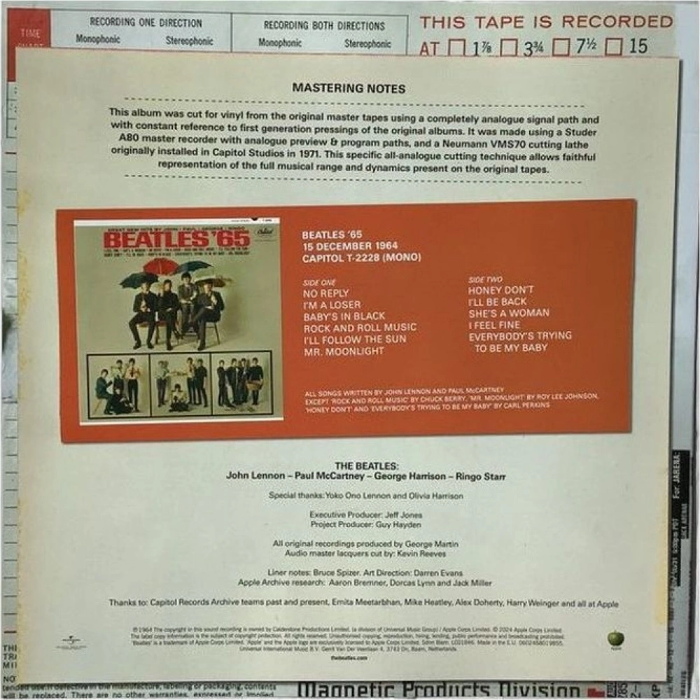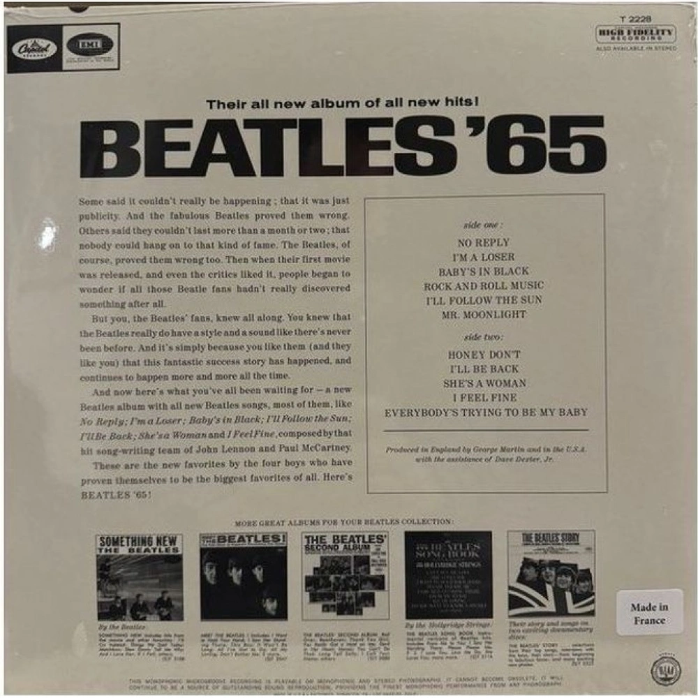 Beatles ’65 содержит восемь песен с британского альбома Beatles for Sale, а также I Feel Fine / Shes a Woman и Ill Be Back с британского альбома A Hard Days Night. Издание на виниле 180 г, моно. Мастеринг был выполнен Кевином Ривзом в студии East Iris Studios в Нэшвилле с использованием оригинального моно-мастера 1964 года. Новое издание остается верным оригинальному релизу, позволяя услышать больше музыкальной информации, чем было возможно ранее. Включает в себя точно воссозданную обложку и новую четырехстраничную вставку с эссе американского историка Beatles Брюса Спайзера.