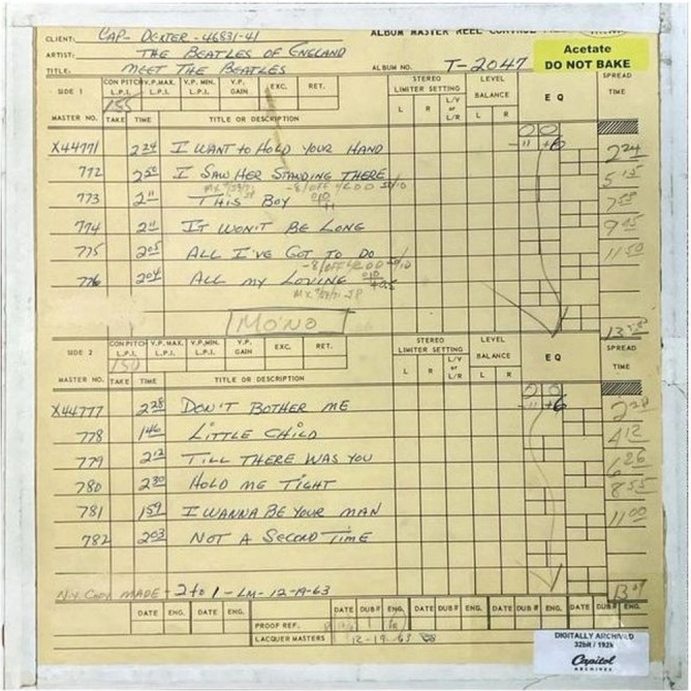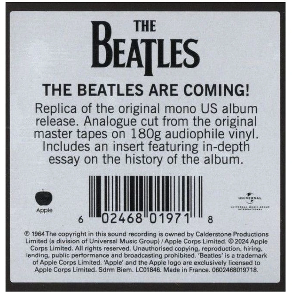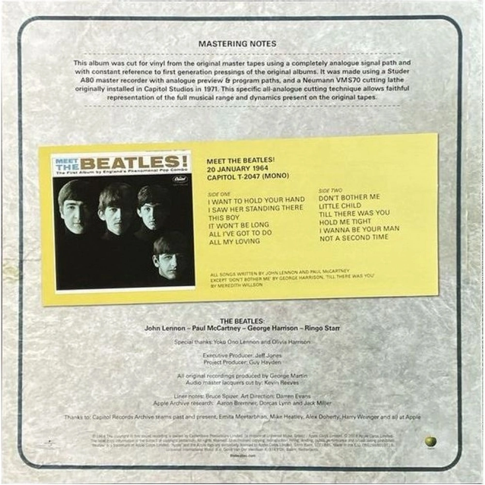 «Meet The Beatles» — второй альбом Beatles в США. Он во многом идентичен второму студийному альбому «With The Beatles», который был записан на студии Abbey Road в период с 18 июля по 23 октября 1963 года. Издание на виниле 180 г, моно.. «Meet The Beatles» начинается с трех синглов «I Want To Hold Your Hand», «I Saw Her Standing There» и «This Boy!», которые не были включены в «With The Beatles». Затем следует вступительный трек с английского релиза Parlophone «With The Beatles» с четвертым треком на «Meet The Beatles», «It Wont Be Long». Мастеринг был выполнен Кевином Ривзом в студии East Iris Studios в Нэшвилле с использованием оригинального моно-мастера 1964 года. Новое издание остается верным оригинальному релизу, позволяя услышать больше музыкальной информации, чем было возможно ранее. Включает в себя точно воссозданную обложку и новую четырехстраничную вставку с эссе американского историка Beatles Брюса Спайзера.