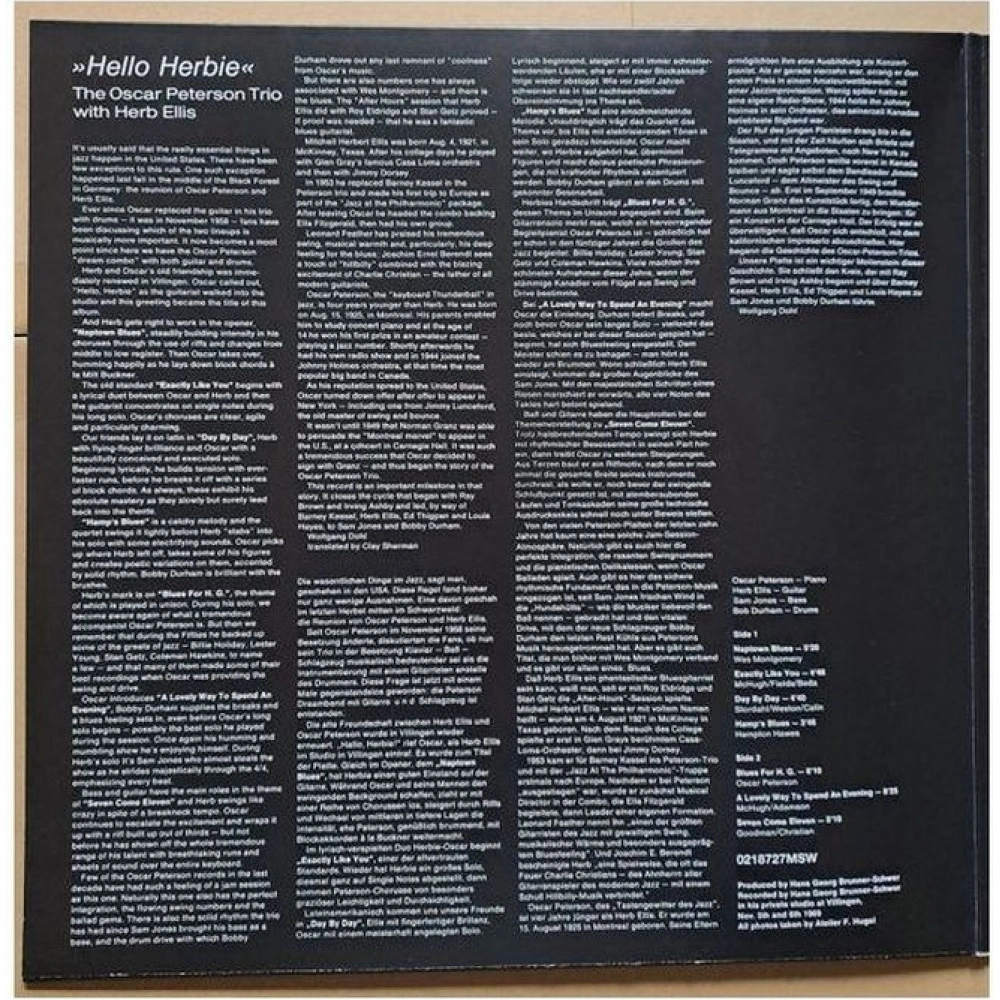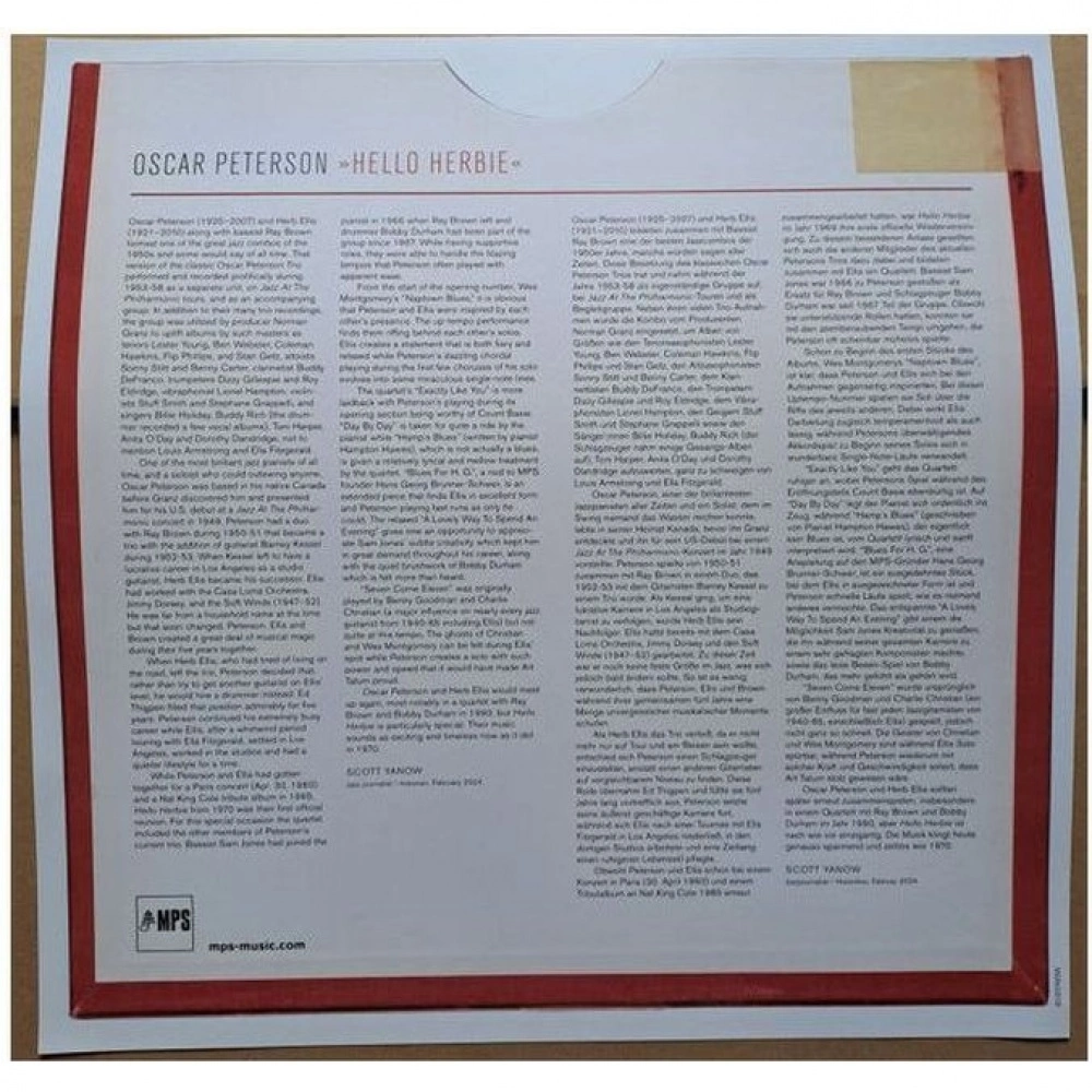 Вневременной джазовый шедевр «Hello Herbie», записанный в 1969 году Трио Оскара Питерсона вместе с легендарным гитаристом Хербом Эллисом. Издание на виниле.. Это великолепное воссоединение Оскара Питерсона с гитаристом Хербом Эллисом, который был постоянным членом трио Питерсона в 1953-58 годах. Уникальная запись, где Эллис и Питерсон вдохновляют друг друга и подталкивают один другого к превосходным выступлениям. Альбом включает некоторые из самых известных песен Питерсона, такие как «Exactly Like You» или «Naptown Blues». Также в записи участвовали Боб Дарем (ударные) и Сэм Джонс (бас).