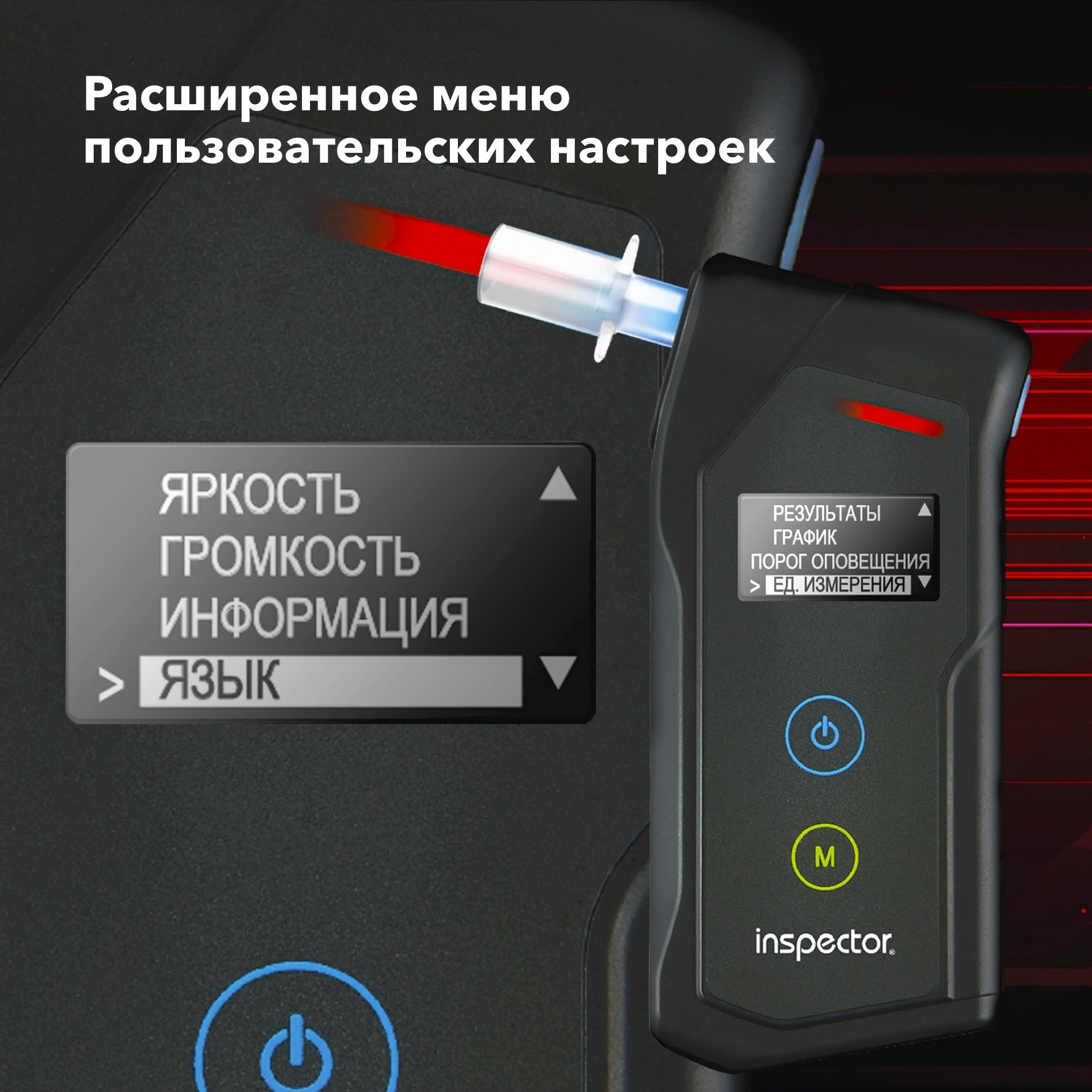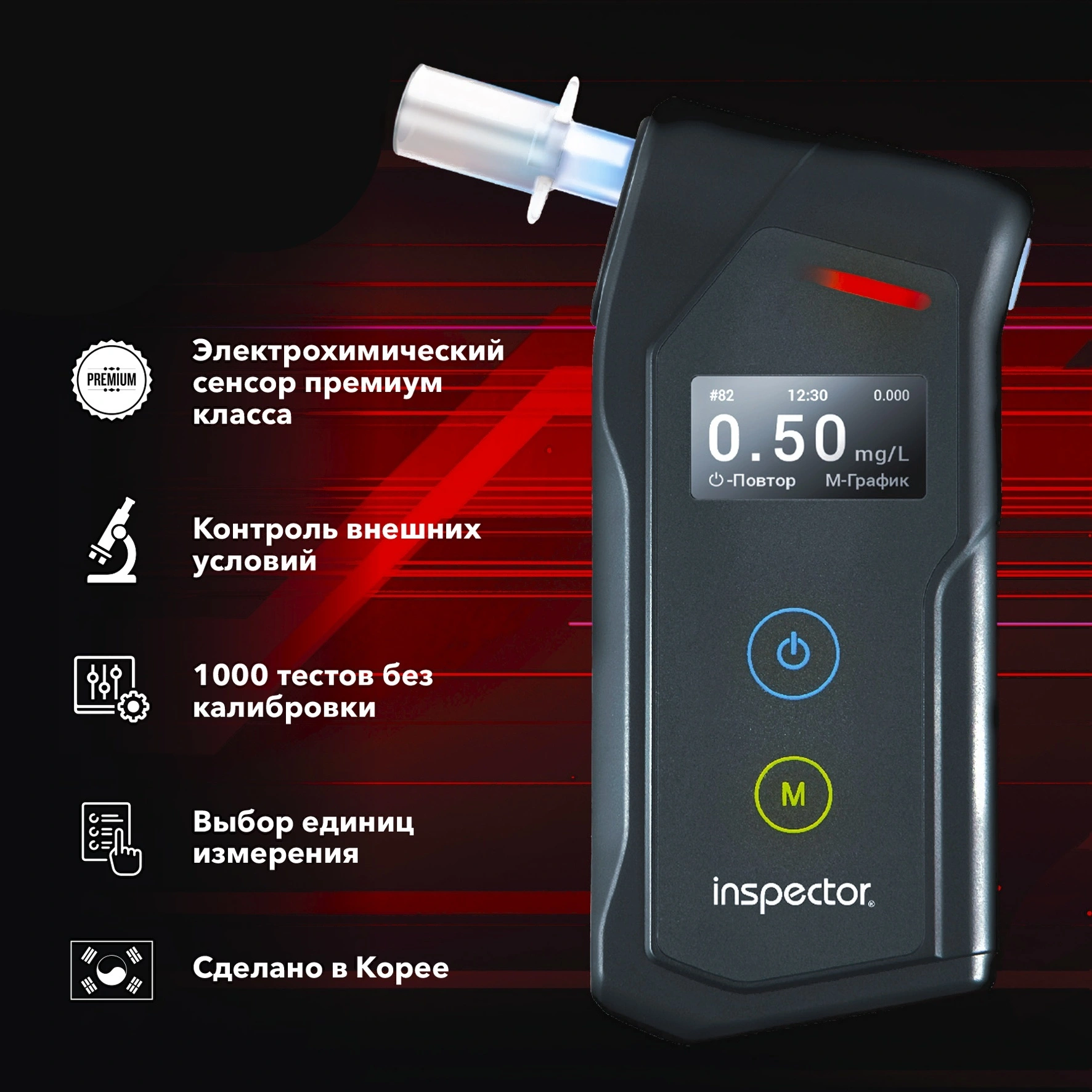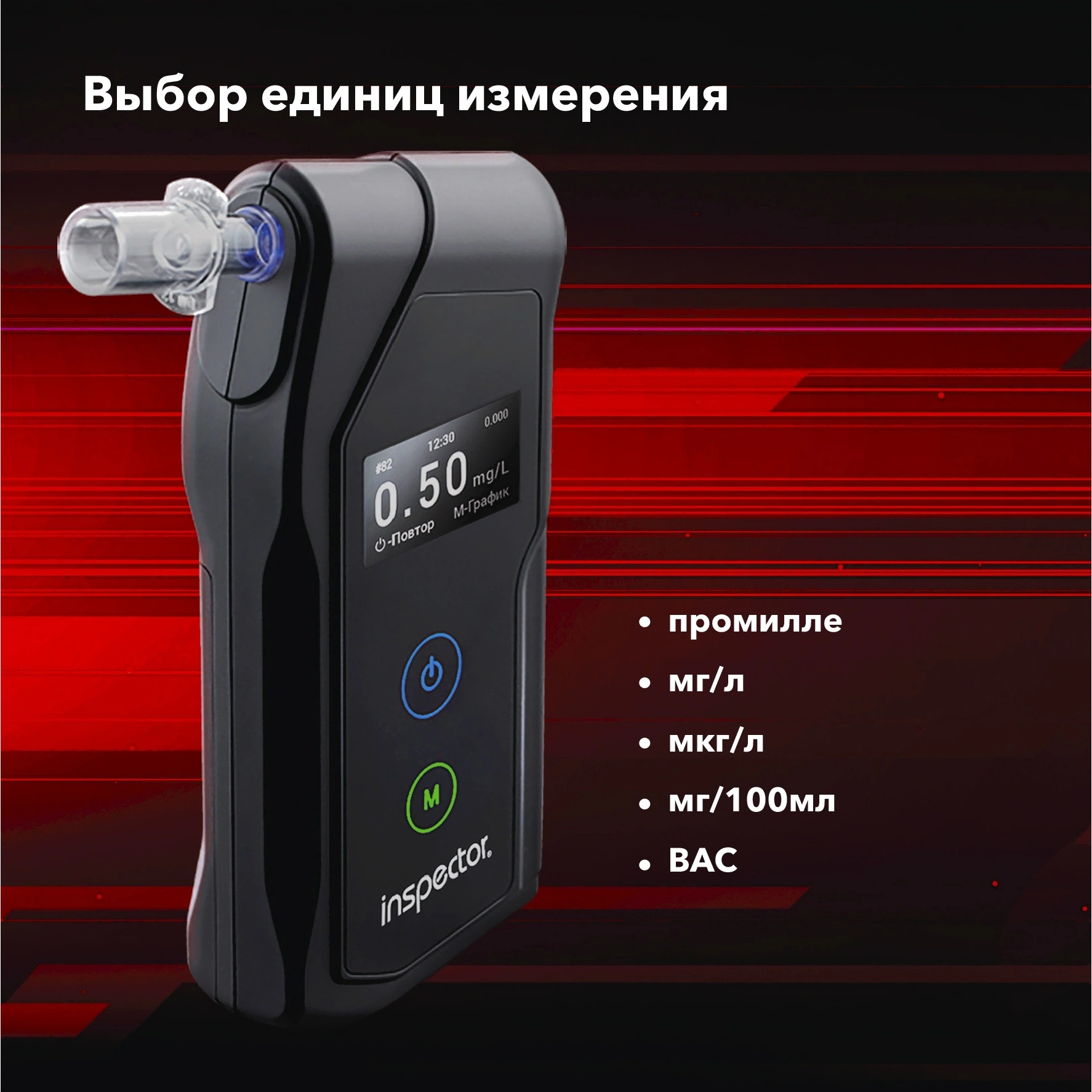 Профессиональный алкотестер INSPECTOR AT1100 с высокой точностью измерений. Устройство предназначено как для корпоративного, так и для индивидуального использования. Устройство производит измерение уровня алкоголя в выдыхаемом воздухе при помощи электрохимического сенсора премиум-класса, имеет датчик загрязнения, способно показывать результат в 4-х единицах измерений, контролировать внешние условия окружающий среды для получения достоверных данных, строить график последних тестов и хранить до 100 последних результатов.