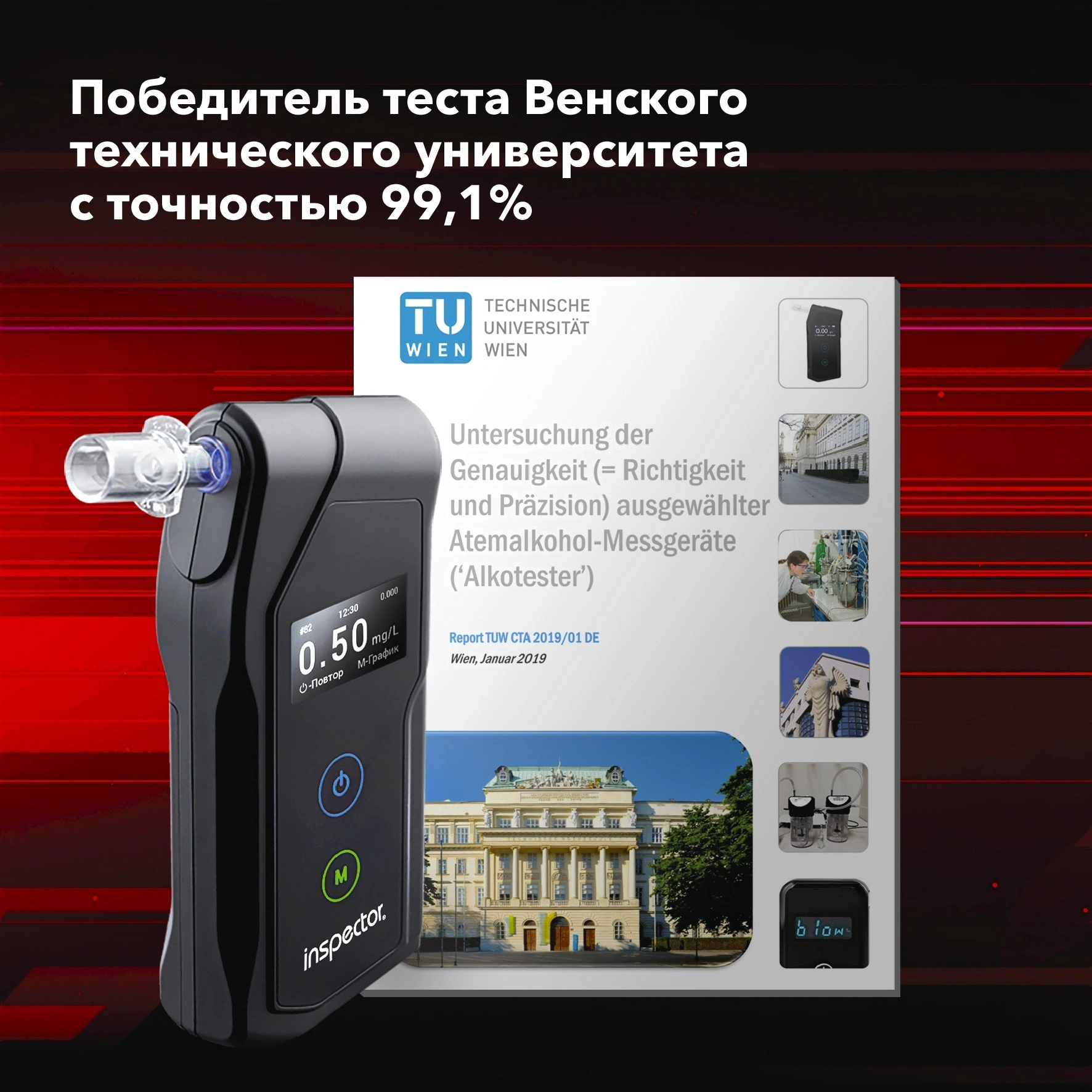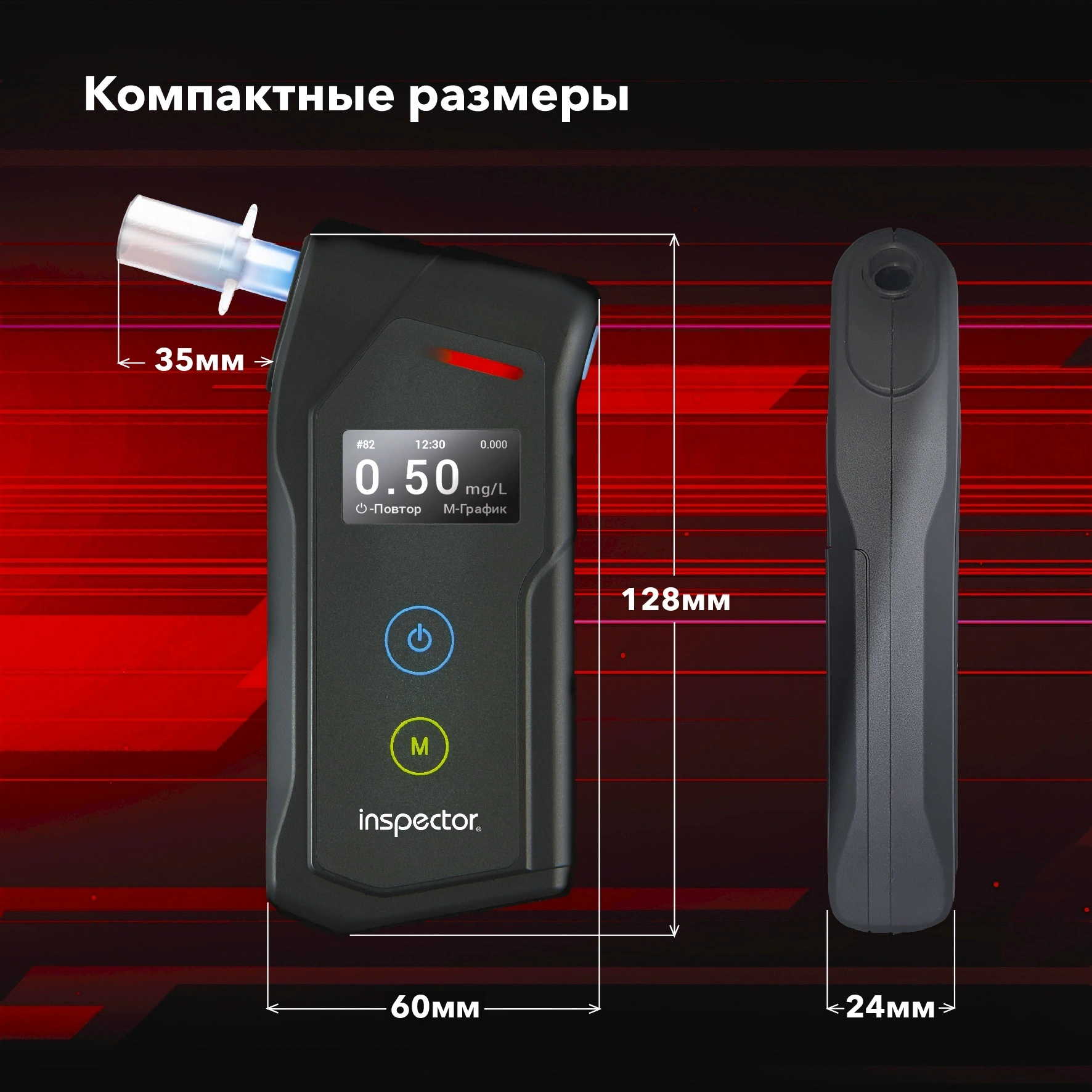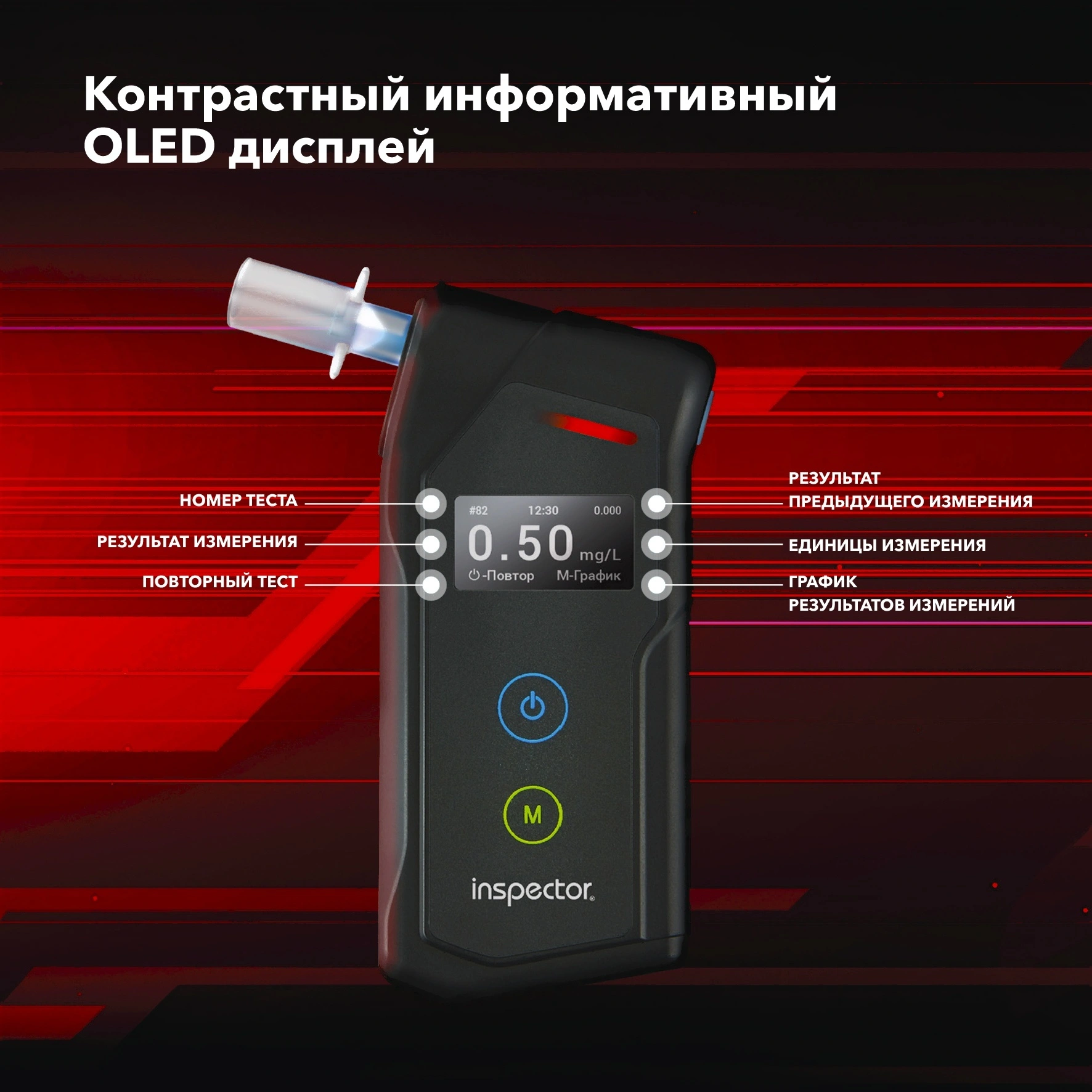 Профессиональный алкотестер INSPECTOR AT1100 с высокой точностью измерений. Устройство предназначено как для корпоративного, так и для индивидуального использования. Устройство производит измерение уровня алкоголя в выдыхаемом воздухе при помощи электрохимического сенсора премиум-класса, имеет датчик загрязнения, способно показывать результат в 4-х единицах измерений, контролировать внешние условия окружающий среды для получения достоверных данных, строить график последних тестов и хранить до 100 последних результатов.