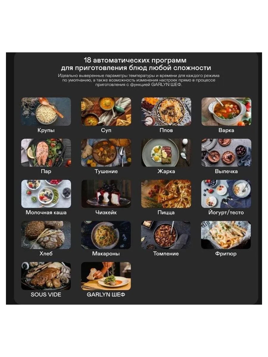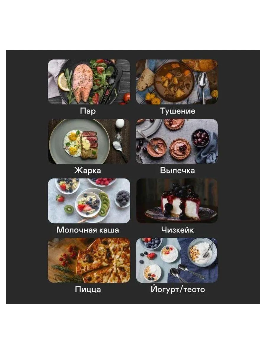 варка, выпечка, жарка, йогурт/тесто, крупы, макароны, молочная каша, на пару, пицца, плов, су-вид, суп, томление, тушение, фритюр, хлеб, чизкейк