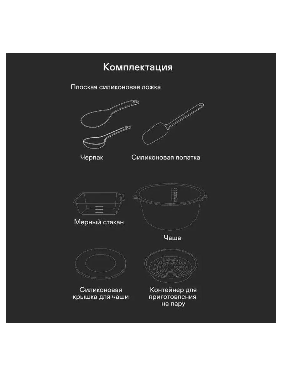 документация, кабель питания, корзина для приготовления на пару, крышка для чаши, мерный стакан, плоская ложка, половник, прихватка, силиконовая лопатка, чаша