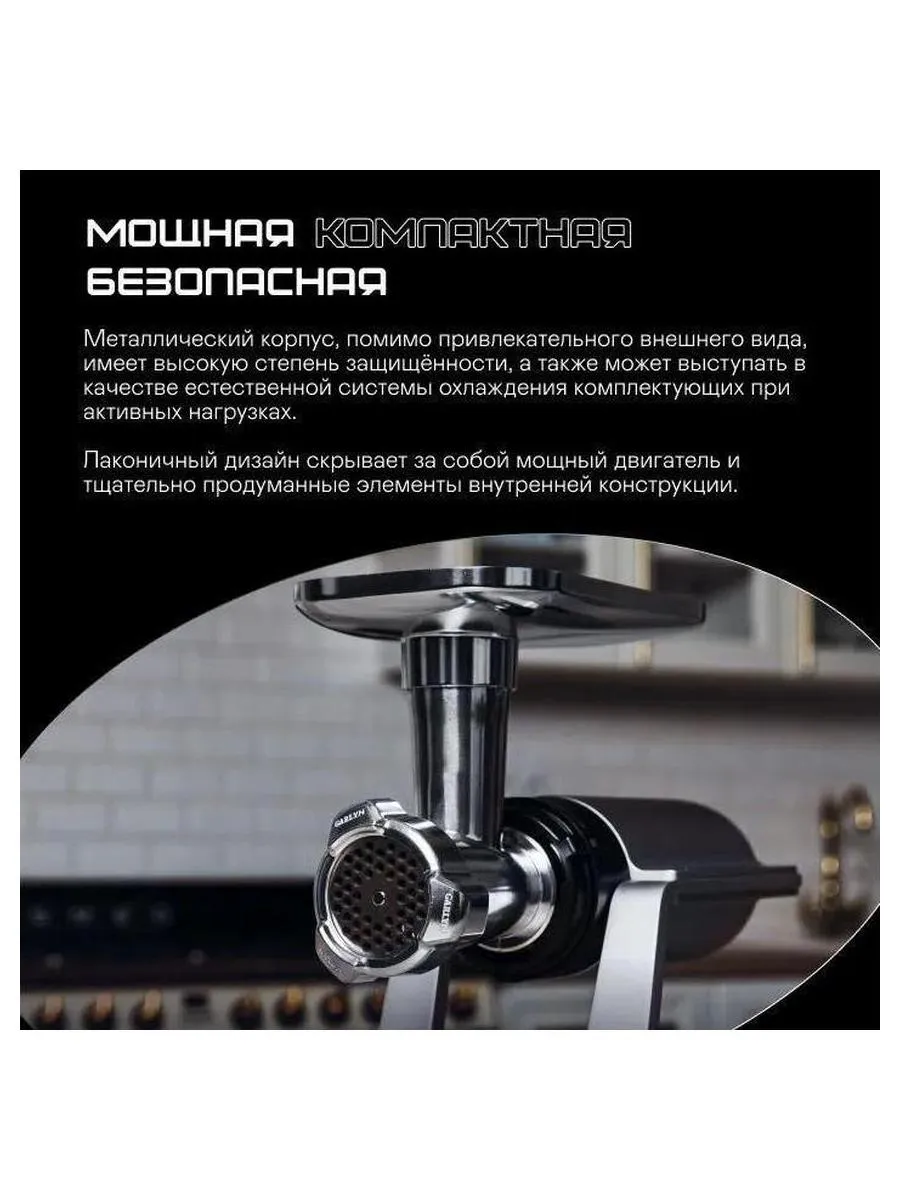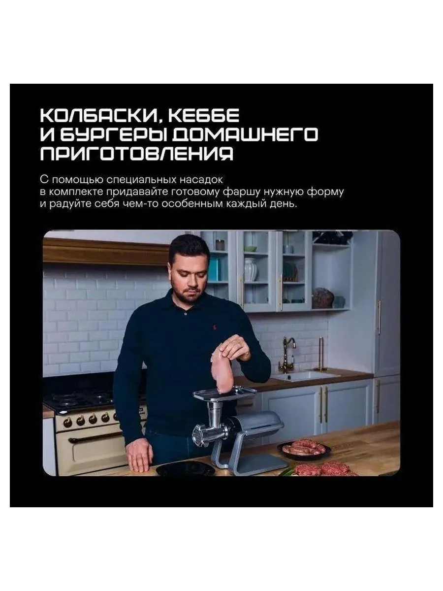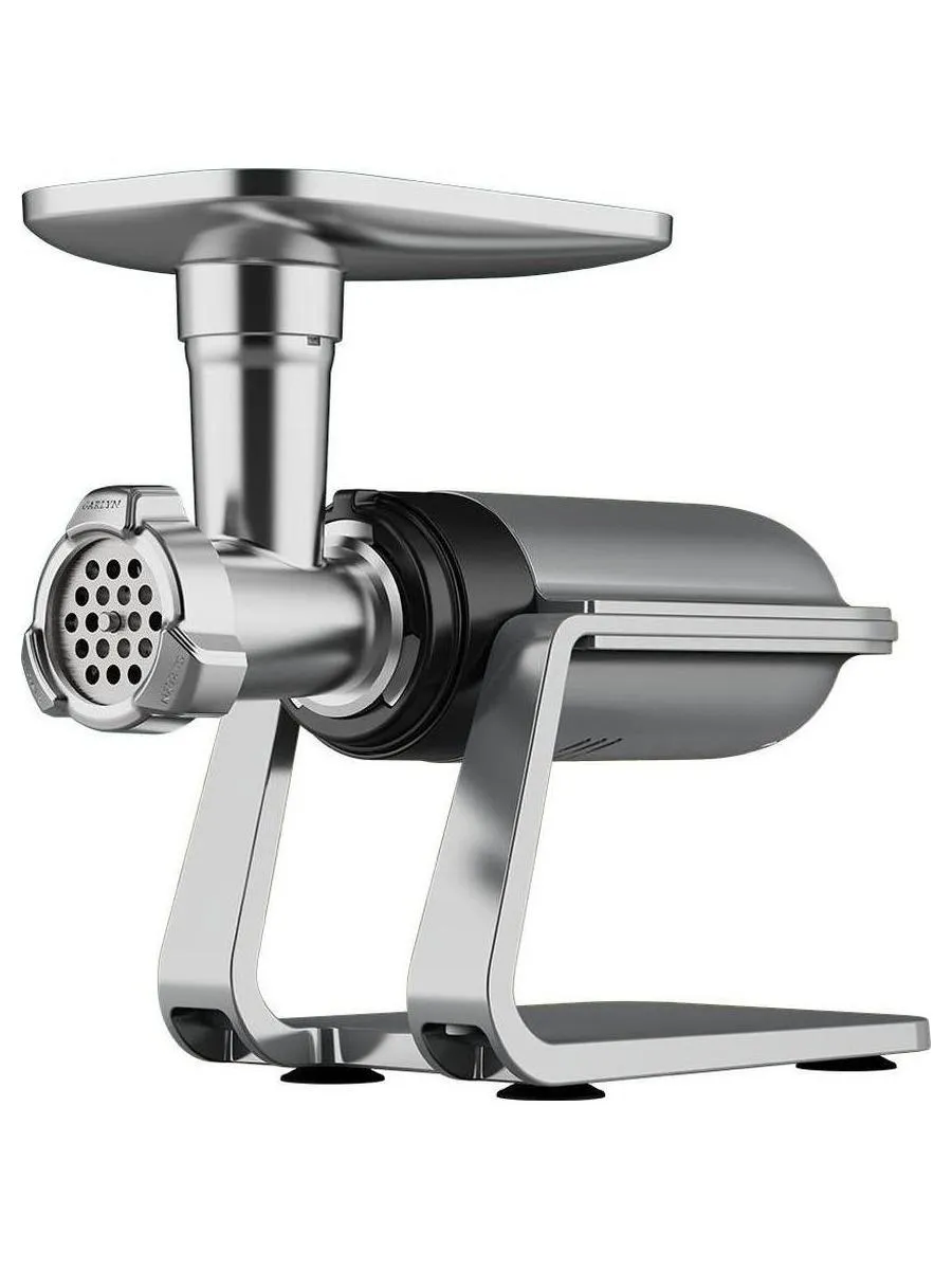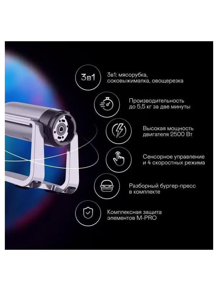 Мясорубка Garlyn NLO 2.0 - устройство 3в1: мясорубка, соковыжималка, овощерезка. За лаконичным дизайном скрывается мощный двигатель и тщательно продуманные элементы внутренней конструкции, которые позволяют приготовить фарш из разных видов мяса и рыбы с невероятной скоростью – производительность 5.5 кг за 2 минуты. Подготовить фарш необходимой консистенции под разный тип блюд помогут диски из нержавеющей стали диаметром 3, 5 и 8 мм. Для их быстрой очистки после готовки в комплекте поставляется двустороннее приспособление из силикона. Мясорубка оснащена набором аксессуаров для приготовления домашних колбас, кеббе, зраз и котлет для бургеров. Модель сочетает в себе функционал сразу 3-х устройств, помимо основного блока мясорубки со всеми необходимыми насадками в комплектации присутствуют сменные блоки (овощерезка и соковыжималка). Тёрка и шинковка продуктов в автоматическом режиме, простота приготовления драников, свежевыжатый сок из твёрдых и мягких плодов с одним многофункциональным устройством. Управление мясорубкой проходит с помощью сенсорного экрана, что делает использование крайне комфортным и интуитивно понятным. Для пользователя доступны 4 режима работы, которые помогут подобрать идеальные настройки для каждого конкретного случая. GARLYN NLO 2.0 также порадует пониженным уровнем шума при работе и устойчивостью благодаря ножкам-присоскам. От преждевременного износа, повреждений и поломок мясорубку сбережёт комплексная система защиты элементов M-Pro.