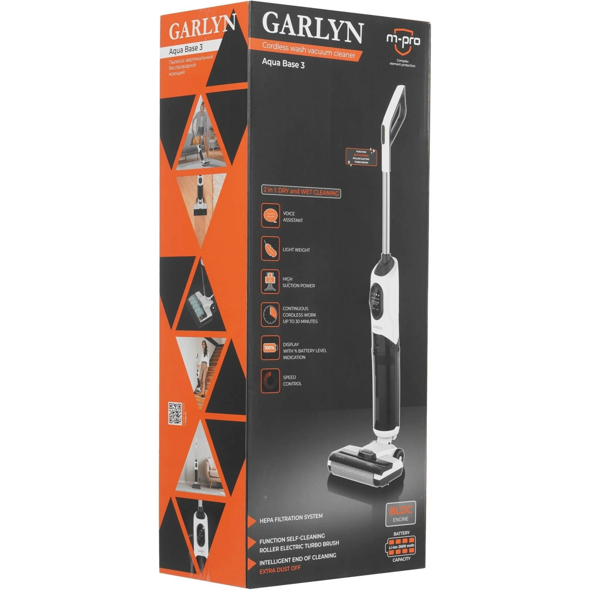 Беспроводной моющий пылесос GARLYN Aqua Base 3 – устройство вертикального типа с зарядной станцией, которое производит эффективную сухую и влажную уборку до 30 минут в автономном режиме. Благодаря литий-ионному аккумулятору с высокой мощностью 2600 мАч сила всасывания устройства достигает 11500 Па, пылесос с легкостью захватывает крошки, шерсть животных и мелкодисперсную пыль. Самая главная особенность девайса – отсутствие мешающего провода и полная свобода в передвижении.