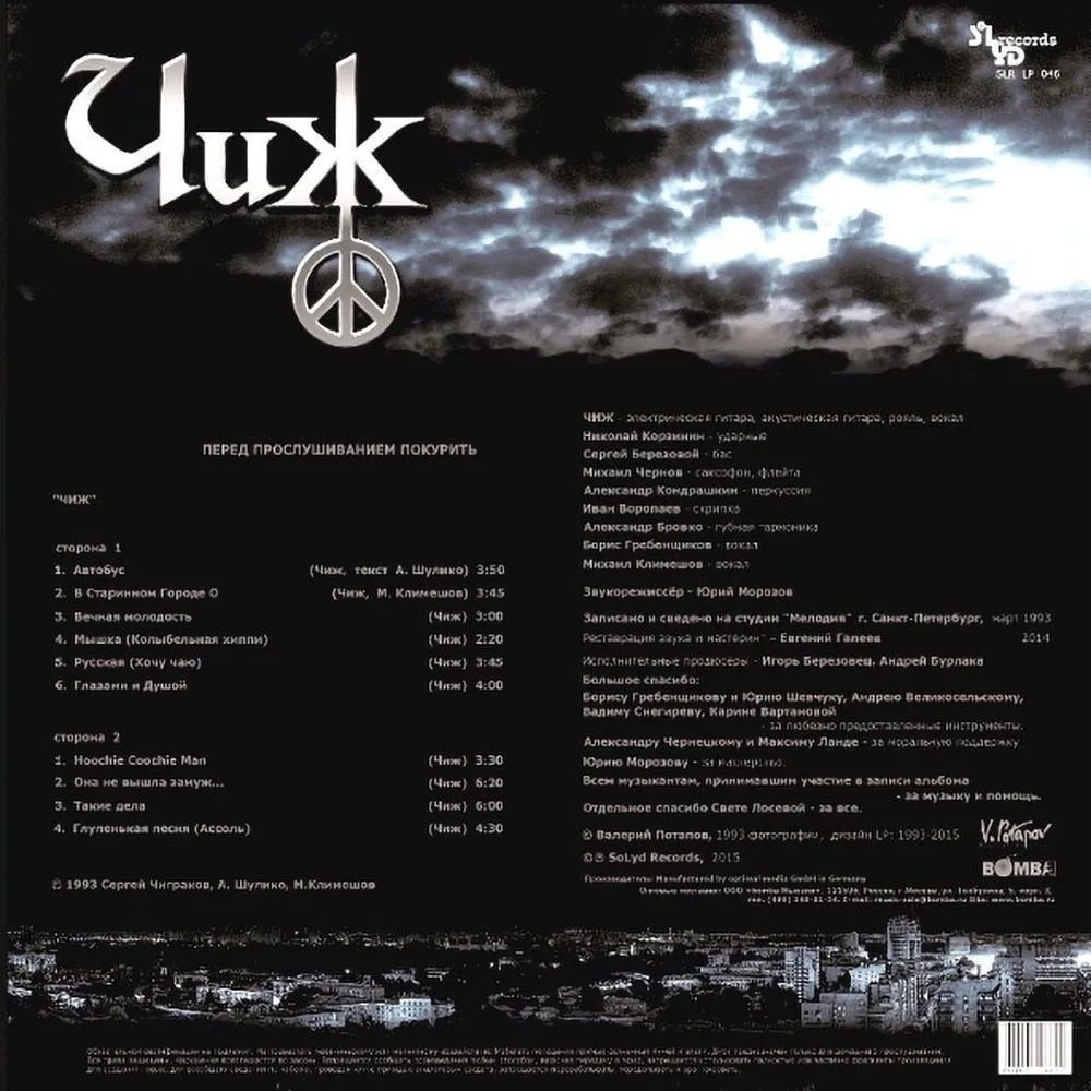 "Чиж" - переиздание первого студийного альбома солиста группы Чиж & Со - Сергея Чигракова, выпущенный в 1994 году. Он был записан в Санкт-Петербурге при помощи известных музыкантов: Бориса Гребенщикова и Сергея Березового (Аквариум), Николая Корзинина (Санкт-Петербург), Андрея Бровко и Михаила Чернова (ДДТ). Презентация альбом произошла спустя три месяца после записи в клубе "Осоавиахим". Издание представлено на аудиофильском 180-граммовом виниле. Сергей "Чиж" Чиграков - гитаристом, вокалистом и автором песен, известный как лидер российской рок-группы Чиж & Со, созданной в начале 1990-х годов. Последний студийный альбом группы вышел в 1999 году, а все последующие альбомы Чигракова - сольные или совместные.