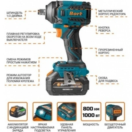 Аккумуляторный гайковерт BORT BSR-21U - это мощный и многофункциональный инструмент, который станет незаменимым помощником как в домашних, так и в профессиональных условиях. Гайковерт серии TiRex, Ti означает - (Torque Innovation) высокий момент с продвинутыми опциями и Rex означает - (Real Extreme), аккумуляторная батарея с высокой токоотдачей. Максимальный крутящий момент: 800 Нм. Этот момент доступен при откручивании, для закручивания момент ограничен 550Нм. Такой лимит введен для исключения разрушения резьбовых соединений. Четыре доступные скорости позволяют гибко подстраивать настройки работы под конкретные задачи, обеспечивая максимальную эффективность и контроль. Нужный режим выбирается на светодиодной панели управления. Количество режимов работы: Три. Гайковерт оснащен функцией автоматической остановки.
