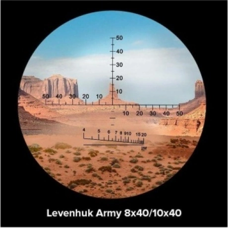 Представляем Levenhuk Army 8x40 с сеткой – бинокль, в котором предусмотрено все необходимое для эффективных наблюдений в полевых условиях. Он отлично проявит себя на охоте и рыбалке, в многодневном походе и на тактической игре. В одном из окуляров прибора есть две измерительные шкалы, с помощью которых можно определять несколько параметров: дистанцию до наблюдаемого объекта, его высоту, углы (вертикальные и горизонтальные). Еще одно преимущество бинокля – широкое поле зрения: одним взглядом можно окинуть протяженную область. Это особенно удобно, если вы наблюдаете за движущимися целями: группами людей, автотранспортом и проч.