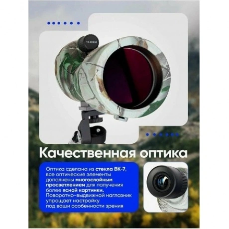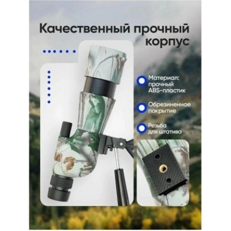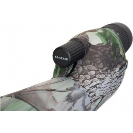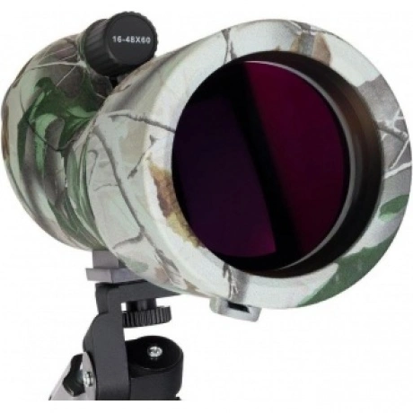 Зрительная труба Levenhuk Camo Rind 60 – надежный и функциональный оптический инструмент для наземных наблюдений. Она идеально подойдет для охоты и изучения городских ландшафтов. Модель не имеет излома оптической оси – можно вести наблюдения сверху вниз, например, с крыши здания или с края обрыва. Труба укомплектована миниатюрным штативом из металла, который оснащен удобной ручкой наведения. Элементы оптической схемы изготовлены из стекла BK-7, линзы покрыты просветляющим составом. Прибор обладает изменяемым увеличением в пределах от 16x до 48x, регулировка кратности производится быстро и удобно – с помощью специального кольца на окуляре. Здесь есть поворотно-выдвижной наглазник, положение которого можно регулировать. Корпус Levenhuk Camo Rind 60 сделан из ABS-пластика – материала, который отличается высокой прочностью. Внешнее резиновое покрытие выполняет сразу две функции: уменьшает скольжение прибора в руках и предохраняет его от пыли и капель воды. Благодаря камуфляжной расцветке пользователь будет надежно замаскирован среди лесной растительности.