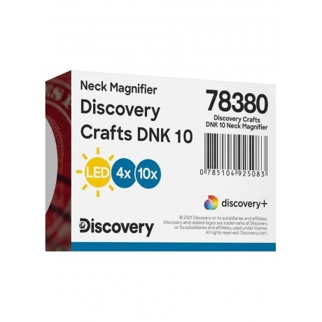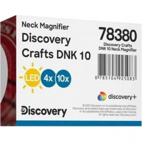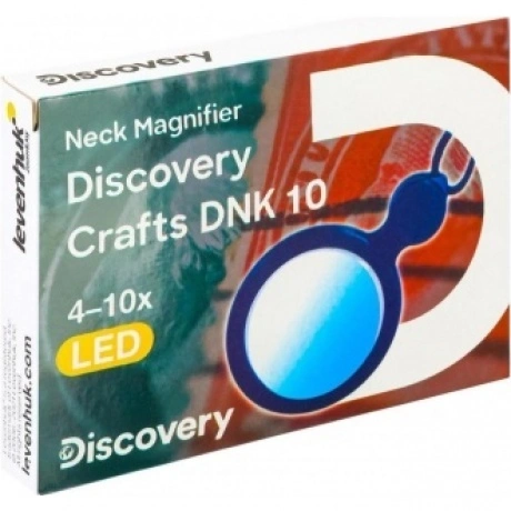 Levenhuk Discovery Crafts DNK 10 – небольшая просмотровая лупа с регулируемым нашейным ремешком. Ее удобно использовать для рассматривания мелких шрифтов, изучения дефектов на разных поверхностях, работы с чертежами и фотографиями и многого другого. Лупа бифокальная: диаметр основной линзы составляет 46 мм, диаметр дополнительной – 12 мм. Увеличения, соответственно, 4 и 10 крат. Обе линзы сделаны из полимерного оптического стекла, прочного, легкого и обладающего высокой степенью прозрачности. Этот материал оптики правильно передает цвета, не искажает геометрию, позволяет видеть мелкие детали четко и ясно. При этом он менее подвержен повреждениям, чем обычное стекло. Лупа снабжена встроенной подсветкой – светодиод расположен в основании небольшой ручки. Это позволяет использовать лупу в полной темноте или при слабой освещенности. Питание подсветки – батарейки.