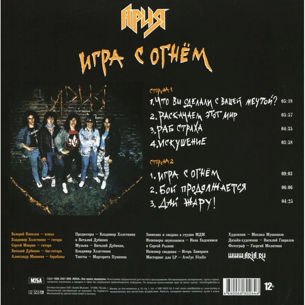 Четвертый альбом «Арии» «Игра с огнем» (1989) оказался для группы в определенном смысле этапным — это была первая работа, записанная квинтетом вне союза с менеджером Виктором Векштейном. Тем не менее, альбом получился очень цельным и по-хорошему музыкально монолитным — возможно, причина в том, что весь песенный материал был написан совместно гитаристом Владимиром Холстининым и басистом Виталией Дубининым. Будучи изданным на виниле в первый раз год спустя после записи, «Игра с огнем» произвела широкий общественный резонанс, хотя весной-летом 1990-го соотечественникам было совсем не до хэви-метала. Важной вехой для группы оказалась титульная композиция альбома, ставшая, несомненно, прототипом для всех ее последующих эпических сочинений — по внутренней драматургии с этим девятиминутным номером сравнится немного номеров из наследия «Арии». Впрочем, песни «Раскачаем этот мир» и «Дай жару!» также пополнили золотой фонд группы. «Игра с огнем» не переиздавалась на виниле почти четверть века, но теперь музыкальный материал альбома представлен нашей фирмой в специальном ремастеринге для винила, произведенном в 2013 году под наблюдением музыкантов группы.