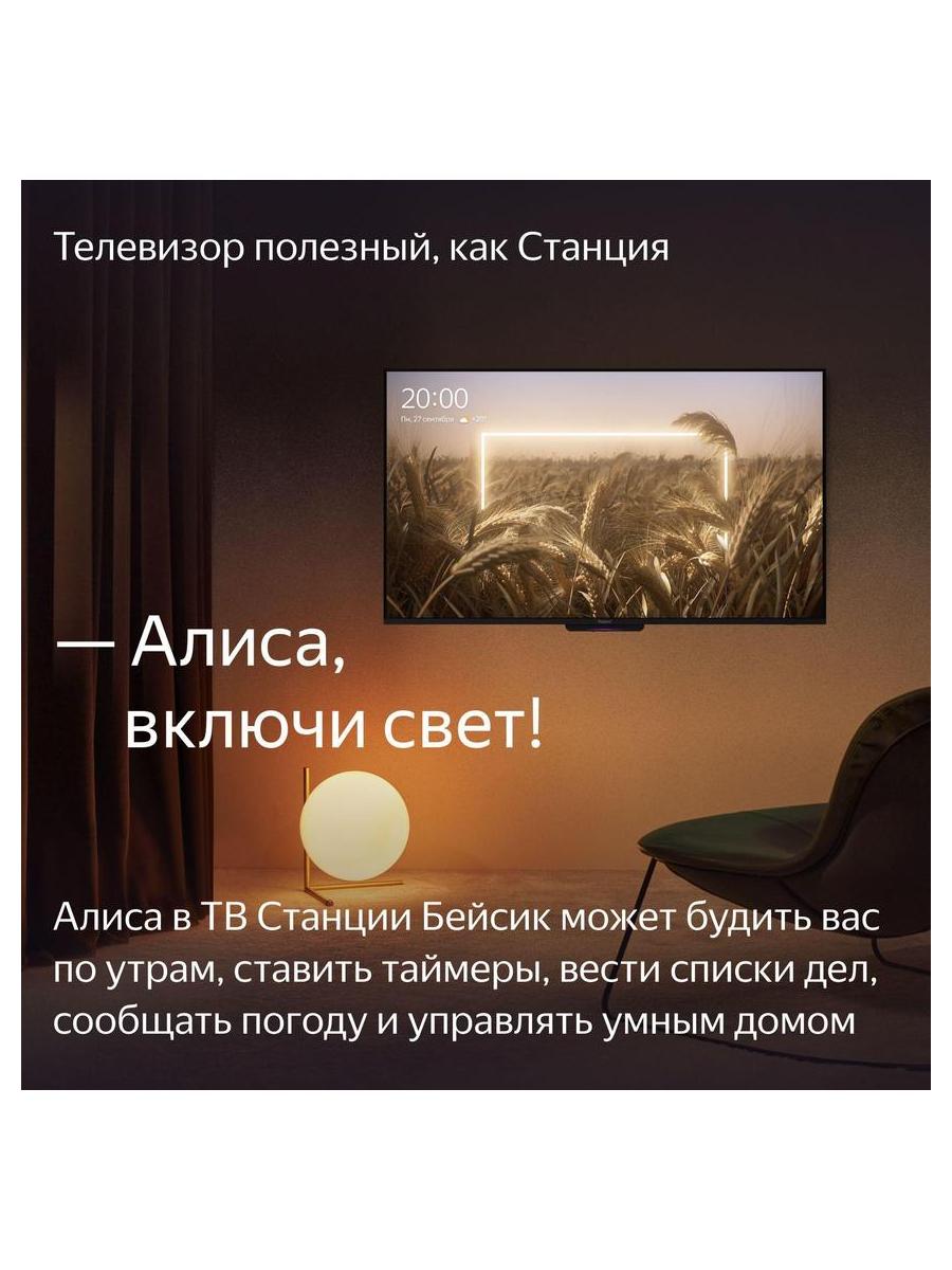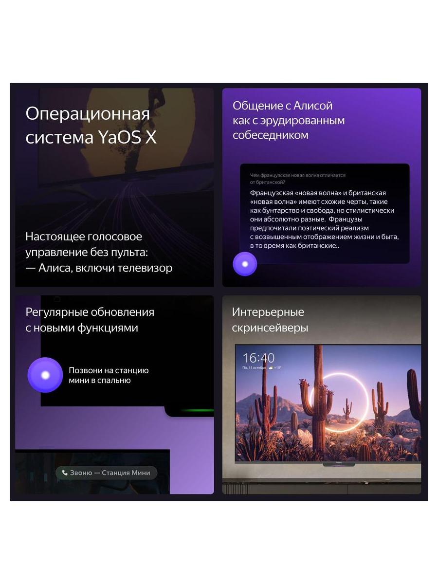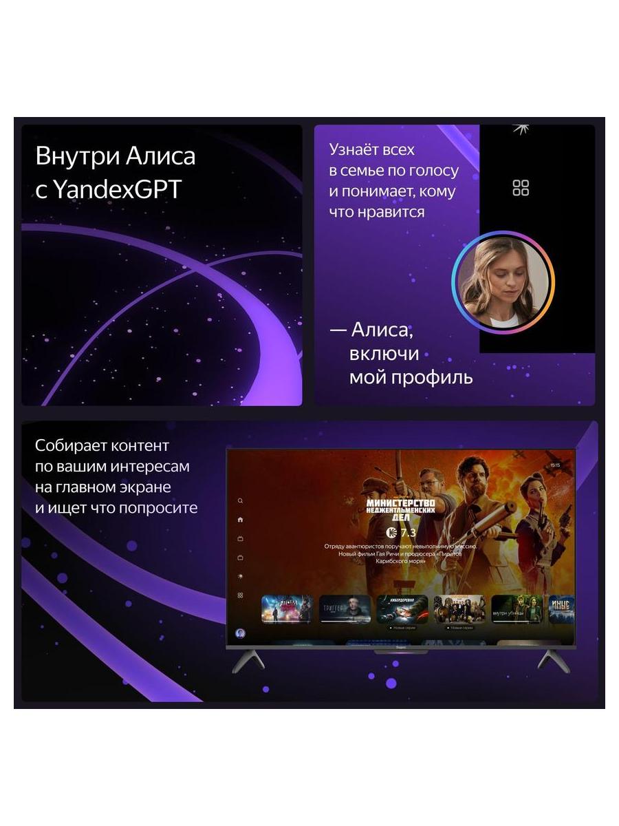 умный телевизор с 4k разрешением, поддержкой hdr10 и голосовым ассистентом алисой, работает на платформе яндекс.тв, имеет безрамочный дизайн и поддержку wi-fi.