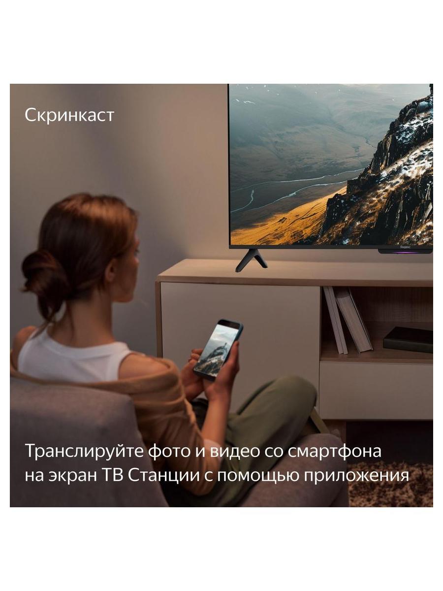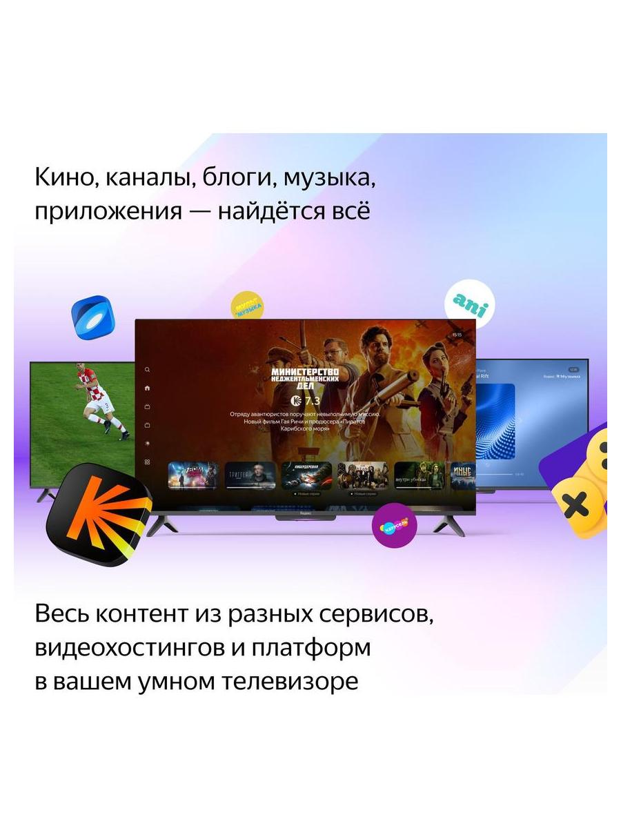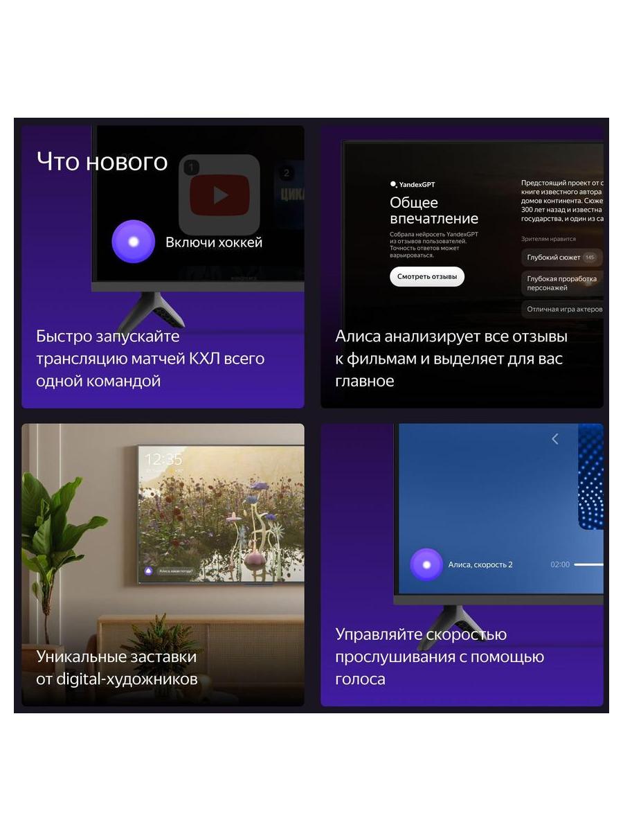 умный телевизор с 4k разрешением, поддержкой hdr10 и голосовым ассистентом алисой, работает на платформе яндекс.тв, имеет безрамочный дизайн и поддержку wi-fi.