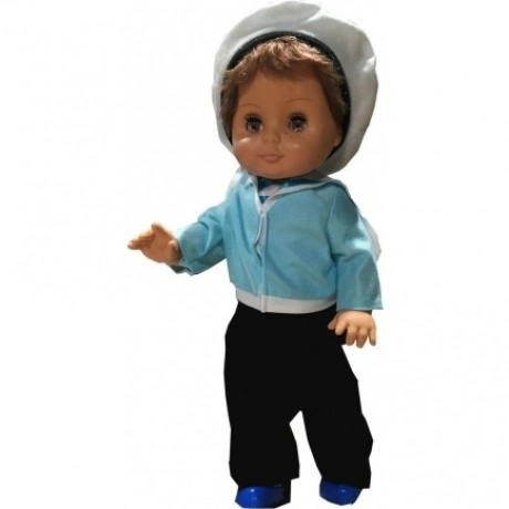 Кукла Морячок ростом 40 сантиметров. Голова с прошивными волосами, короткие. Если куклу положить вертикально она закроет глаза, есть ресницы. Кукла одена на тему профессии моряк. У куклы твердое пластмассовое тело.