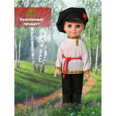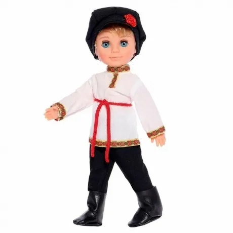 Мальчик в русском костюме станет замечательным другом для вашего ребенка. В увлекательно-игровой форме ребенок познакомиться с обычаями и традициями русского народа. Национальный русский костюм максимально приближен к оригинальному наряду нашей страны. В одежде присутствуют стилизованные элементы народного костюма. В комплект одежды входит рубаха-косоворотка с отделкой тесьмой и поясом из эластичного шнура, брючки, картуз. Костюм дополняют черные сапожки из искусственной кожи. Рост куклы составляет 30 см. Волосы прошиты по всей головке, глаза вставные, закрывающиеся. Роспись лица выполнена вручную, присутствуют элементы нанесения аэрографом. Ручки и голова выполнена из ПВХ-пластизоля, а туловище и ножки из пластмассы. Кукла удобна в использовании, ручки и ножки можно поворачивать с легкостью. Продуманная конструкция куклы позволяет её сажать, ставить на ножки и переодевать. Мальчик в русском костюме подходит для разнообразных сюжетных игр и познакомит ребенка с национальными традициями нашей страны. Кукла соответствует Техническому регламенту Таможенного Союза о безопасности детской игрушки.