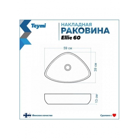 Раковина от финского производителя Teymi является эффективным решением для ванных комнат небольшой площади. Товар произведен в России на современном технологическом оборудовании под контролем известного финского бренда Teymi. Сантехника Teymi давно зарекомендовала себя на международном и российском рынке. Все изделия, выпускаемые этой маркой, получают исключительно положительные отзывы от покупателей. Широкий ассортимент продукции, многообразие форм и размеров и неизменное качество продукции — вот главные преимущества компании.