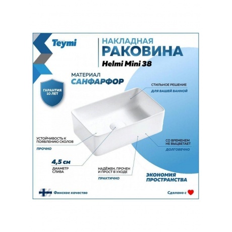 Раковина от финского производителя Teymi является эффективным решением для ванных комнат небольшой площади. Товар произведен в России на современном технологическом оборудовании под контролем известного финского бренда Teymi. Сантехника Teymi давно зарекомендовала себя на международном и российском рынке. Все изделия, выпускаемые этой маркой, получают исключительно положительные отзывы от покупателей. Широкий ассортимент продукции, многообразие форм и размеров и неизменное качество продукции — вот главные преимущества компании.