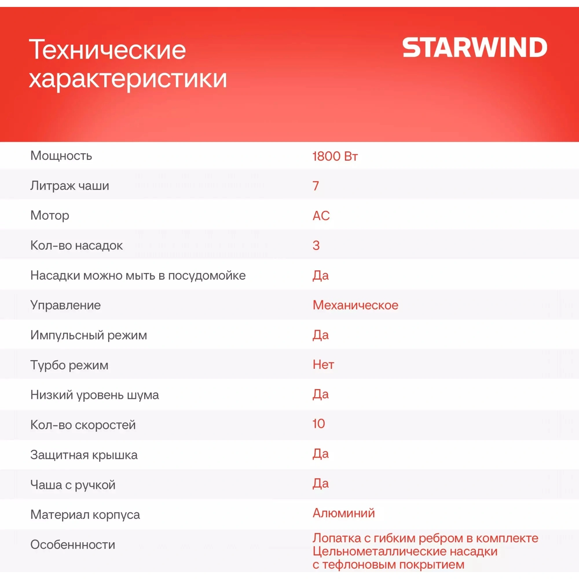 Starwind - лауреат ежегодной национальной премии МАРКА №1 в России 2024 в категории Планетарные миксеры. Этот выбор подтверждает народное доверие, а также качество и надежность продукции Starwind, созданной для вашего удобства и удовольствия в готовке. Планетарный миксер Starwind SPM4173 представитель 4 серии и обладает целым рядом преимуществ, включая эффективность, экономичный расход электроэнергии, надежность и простоту в обслуживании.