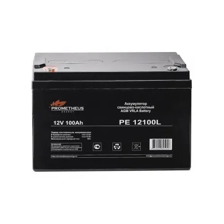 Prometheus Energy свинцово-кислотный аккумулятор PE 12100L создан по технологии AGM, с абсорбированным электролитом и увеличенным сроком службы. Предлагаемый аккумулятор является необслуживаемым. Он герметизирован, а образующийся газ рекомбинируется. Долив жидкости не требуется. Корпус аккумулятора изготовлен из негорючего ABS пластика. Емкость аккумуляторной батареи для ИБП составляет 100 Ah, а рабочее напряжение 12 V. Устройство обладает низким саморазрядом (<2%). Срок службы достигает 12 лет.